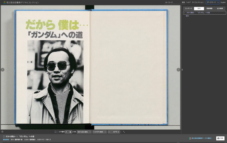 GQuuuuuuXの最終話のタイトルにもなった富野由悠季(喜幸)・著「だから、僕は…」。すでに絶版で古本屋で見つけても6千円とか8千円とかする本ですが、Bさんに国立国会図書館で電子的に閲覧可能、ただし国会図書館に行かないと即時アカウント発行は不可能、と言われました。まぁ急がないしアカウント申し込むかー、と思っていたらMacのパスワードマネージャーが反応。すっかり忘れてましたがアカウント持ってました。なんでアカウント持ってたんだっけ…というのは思い出せなかったです。