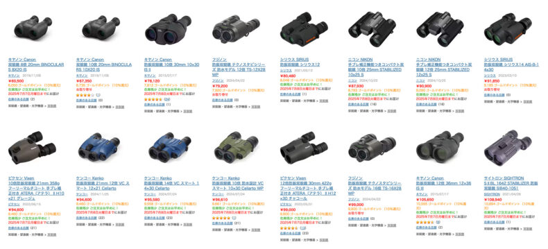 以下はヨドバシの防振双眼鏡を安い順に並べたものです。