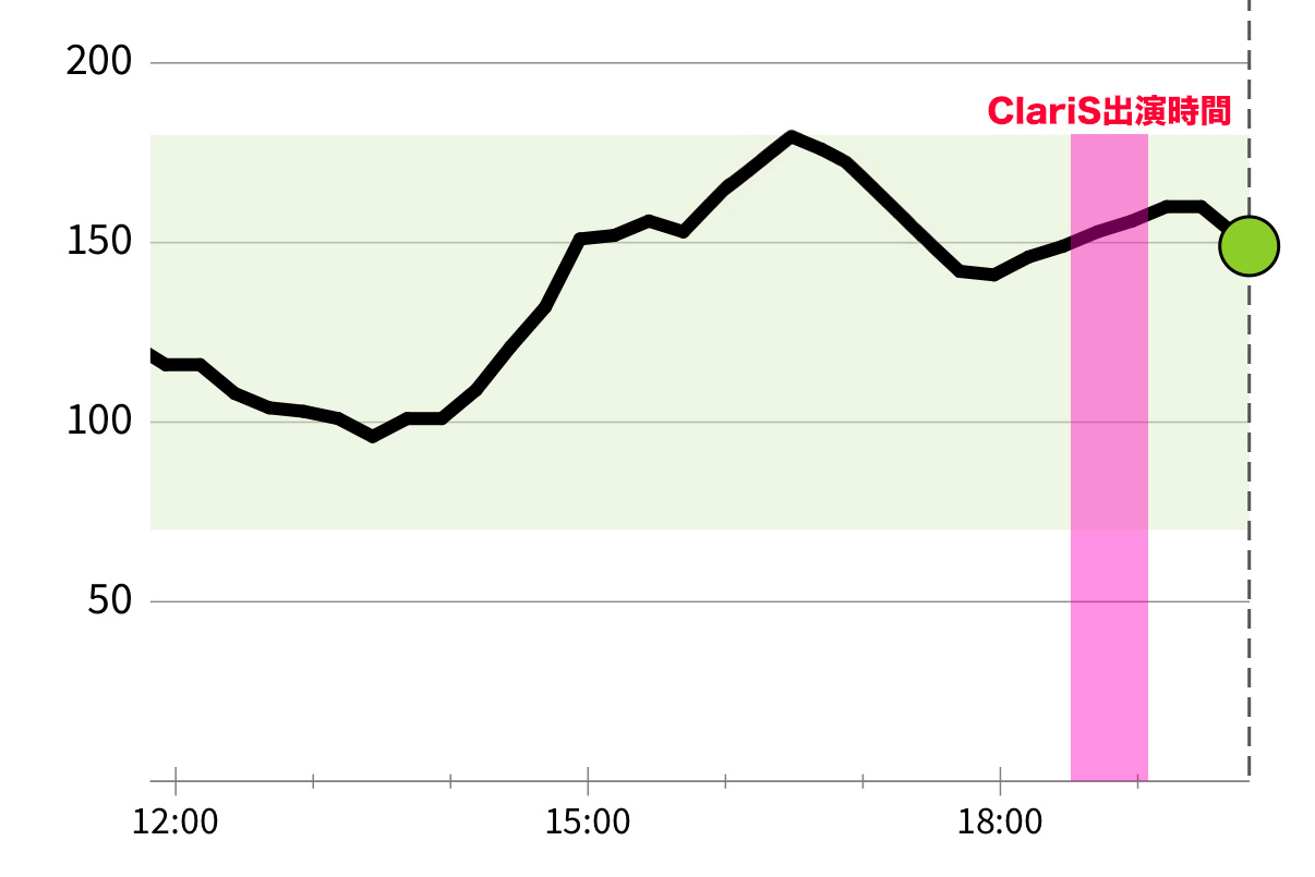 これはたまたま装着していたリブレの測定結果ですが、15:30ごろに昼食後の血糖値上昇のピークがありますが、17:00からライブが始まって、ClariS 出演前後あたりで謎の上昇をしています。何も食べていないので普通は上昇することはないのですが、どうも調べてみると「交感神経の急激な活性化による血糖値上昇」のようです。やべぇっすね ClariS(笑。
