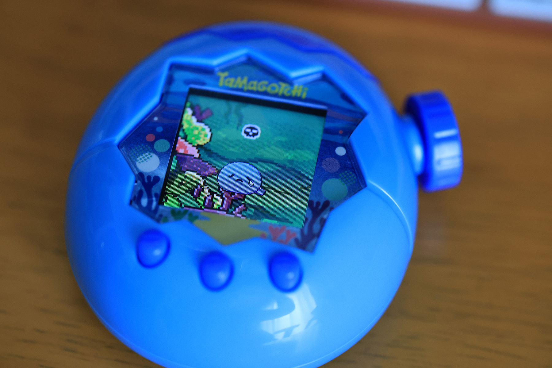 Apple Watch を彷彿とさせるりゅうずが付いていますが、おおよそたまごっちとは思えないスムースさで画面が動きます。でもこの液晶、色味、解像度、すごい既視感があるなと思いましたが、昔の折りたたみ式携帯の背面液晶、あの雰囲気ですね。