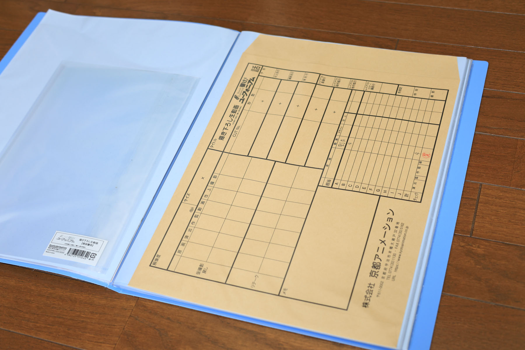 ただ、京アニで使われている動画用紙、サイズが 34cm x 22cm というちょっと規格にないサイズで、A4 より少し大きくて B4 より少し小さい…となると B4 サイズファイルにしか入れようがありません。他のアニメスタジオではA4サイズが使われているらしいのですが…。