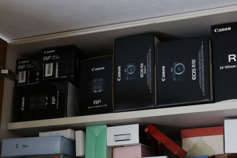 ガンプラ置き場に常々苦心していますが、目についたのはレンズの箱。中身は緩衝材と薄っぺらい取説、保証書しか入ってないのに場所を食います。しかもあまり箱があってもなくても査定にも影響しません。特に最近のRFレンズは緩衝材が単なるプチプチ(エアクッション)だったりするので、捨ててしまっても問題なさそうです。そうすれば箱だけをマトリョーシカ方式で収納すれば、結構な場所の節約になるはず。