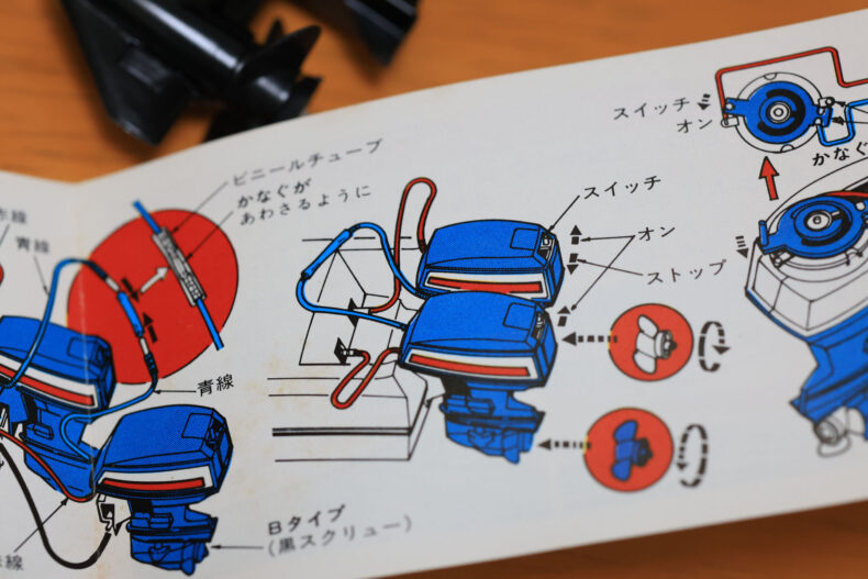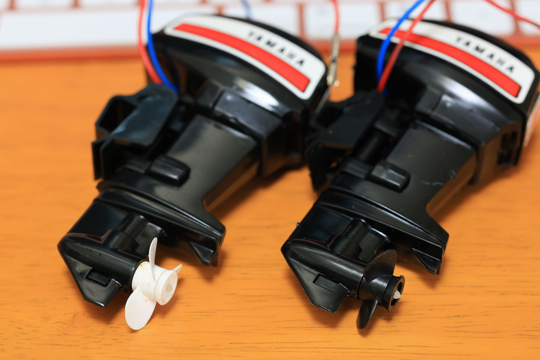 Bタイプのために赤+青-接続で逆回転するようにリード線色を入れ替えた仕様のモータをマブチさんに発注するのはコストかかり過ぎますし、かといってギヤリングを対称構造にするのはもっとかかる。もういっそのこと、スクリューを2種類付けて2機使うなら付け替えてね、とすれば流通は1種類で済みましたね。