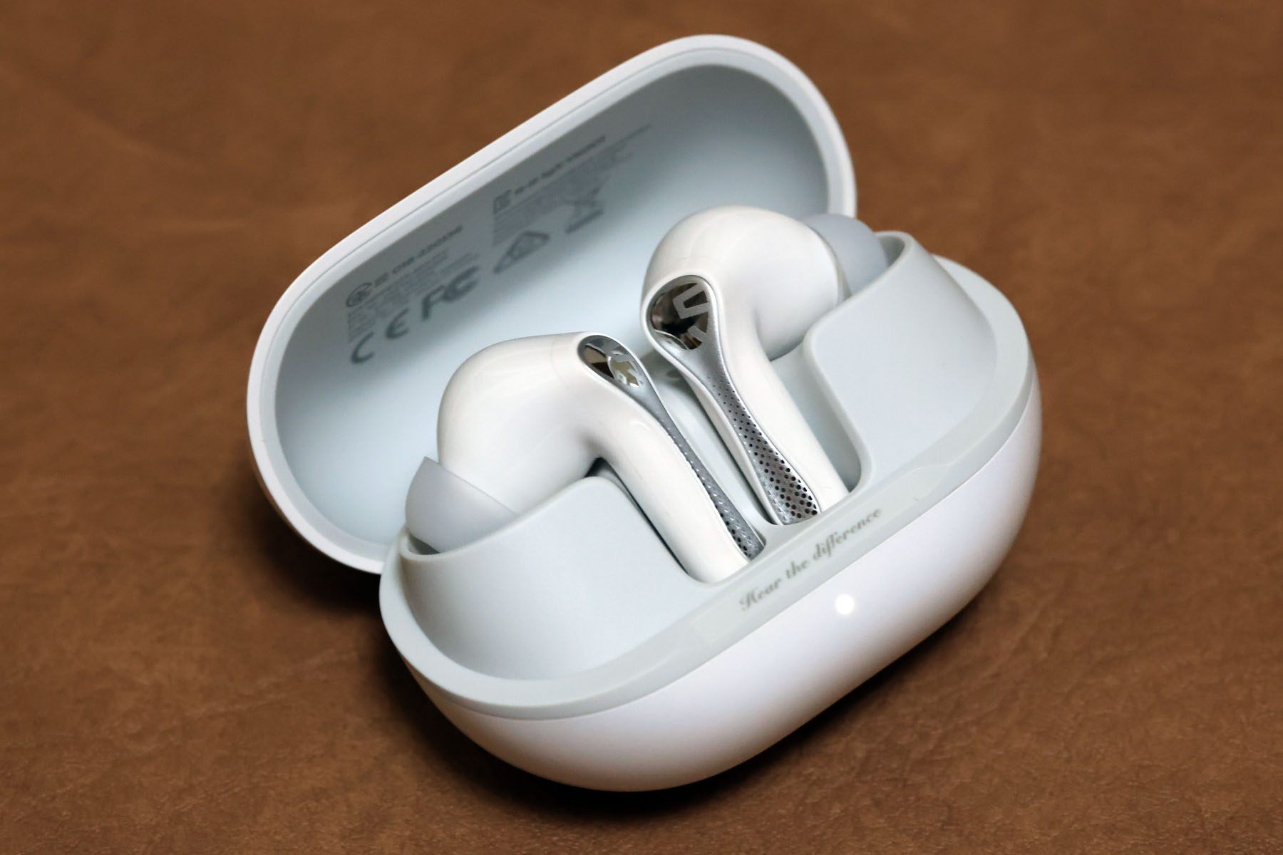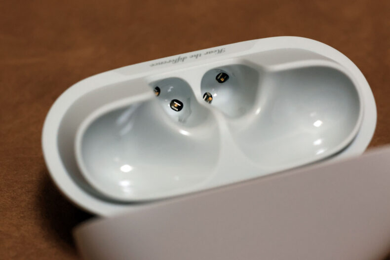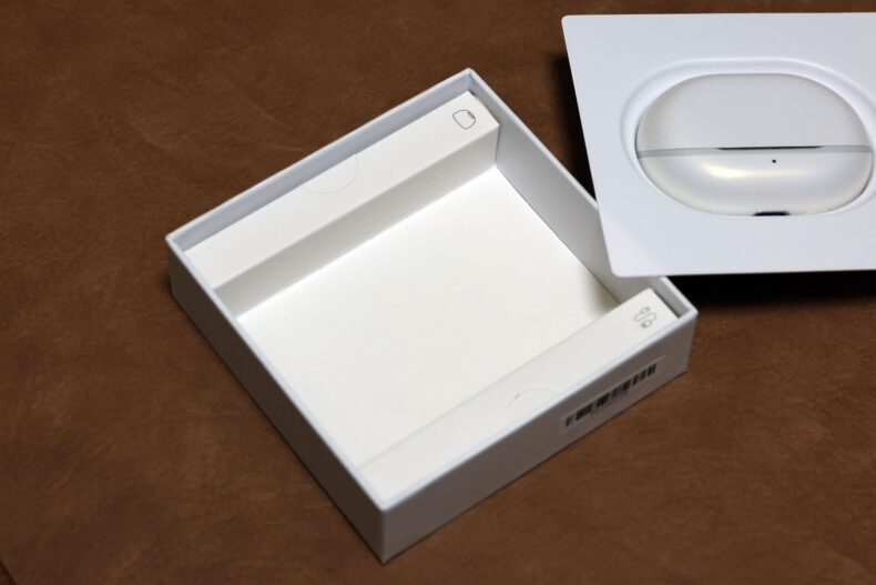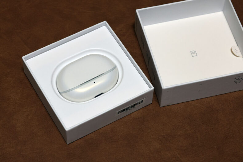 色はブラックとホワイトがありますが、今回提供いただいたのはホワイトです。パールホワイトのケースの質感は、Air 5 から大きく変わったようには見えません。Apple AirPods とはわずかに異なるパール系の質感が特徴です。