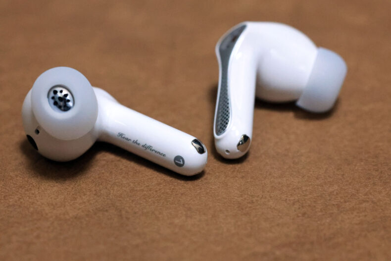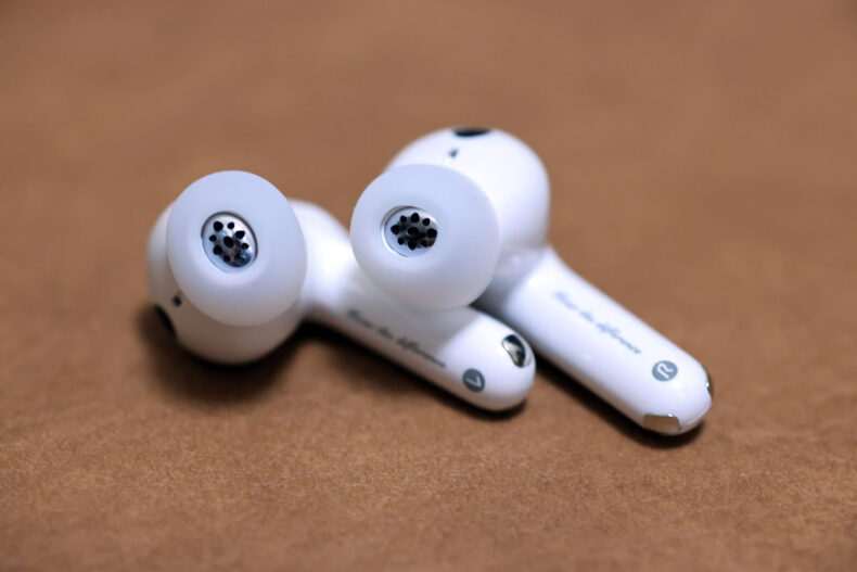 装着感はカナル型ともまた異なる独特なもの。ただし耳から取り出すたびに薄型軽量のイヤーチップが裏返ってしまうのがイマイチに感じました。もう少し厚い素材で作れば良さそうですが、耳への挿入感の軽さを優先しているのでしょうか。但しこれを装着して歩いた時の「びよんびよん」音が小さいのは、もしかするとイヤーチップの薄さが寄与しているのかもしれません。