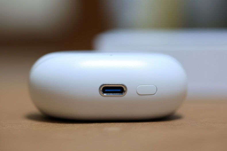 本体底面の USB-C 端子と、Bluetoothペアリングボタンです。ケースはワイヤレス充電には対応しておりませんので、必ず USB-C で充電する必要があります。