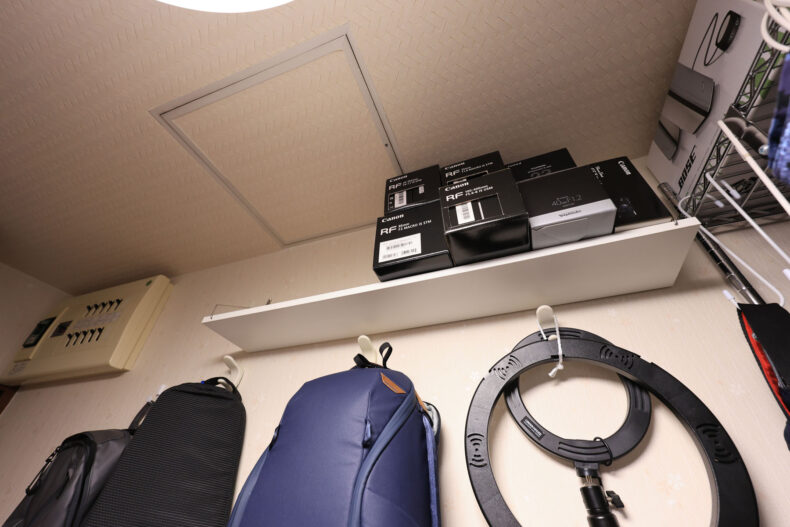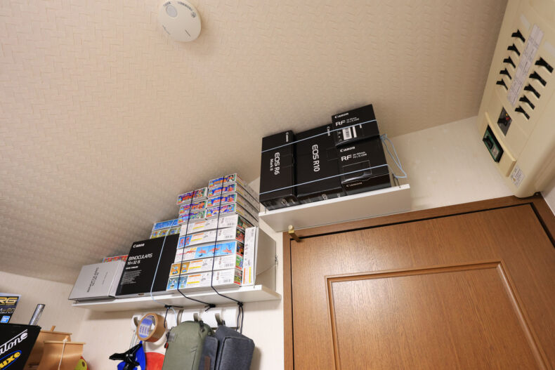 ガンプラが増えてゆくのでスペースを確保しなければなりません。一方でレンズの箱が空調の効いた部屋を占拠しているので、空調が効いていない部屋(倉庫部屋)に移動していただきました。デッドスペースに棚を取り付け、そちらへ。