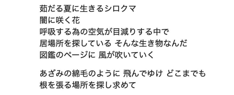 いい歌詞じゃないですか…。「呼吸するための空気が目減りする中で」というのが今後あらゆるリソースが減っていく日本を表しているし、「飛んでゆけ どこまでも 根を張る場所を探し求めて」というのがこれから社会に出る人へのエールですね。