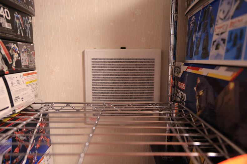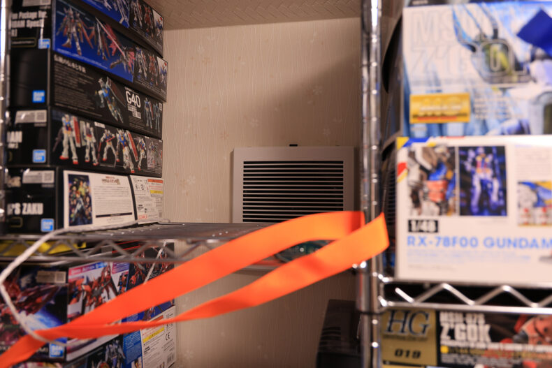 これで温度や湿度を測ってみたのですが、今までは他の部屋から乖離して独自の温度湿度を示していましたが、今度は廊下の温度湿度と一致するようになりました。まぁそれはそうなんですが、冷房がかかっている部屋ほど湿度が低くならず、そこは期待はずれでした。それでもまぁ、熱や湿度やニオイが篭ったままではなくなったのは改善点でしょうか。ガンプラの劣化が遅くなってくれると嬉しいです。
