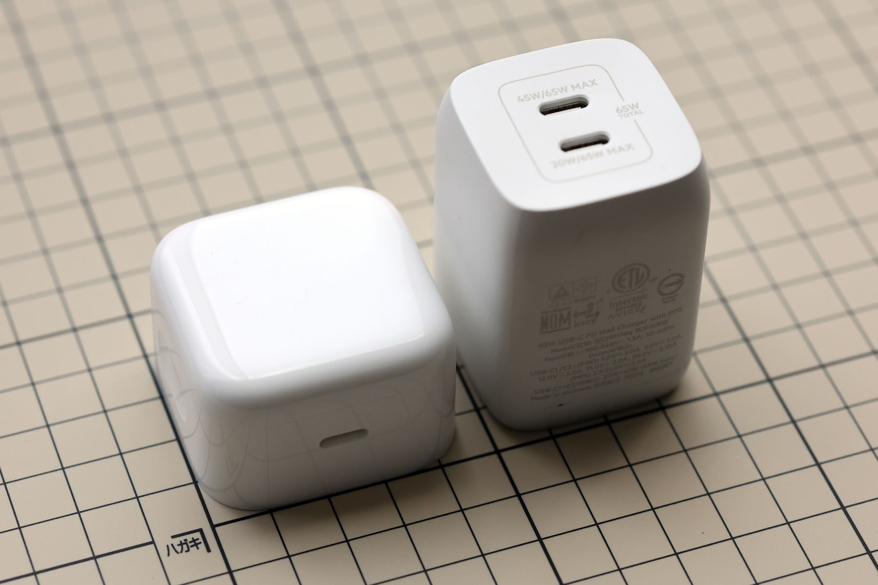 Belkin の最大65W出せる2ポートのアダプターと比較すると、幅、奥行きが1cmくらいずつ大きく、厚みは半分以下です。