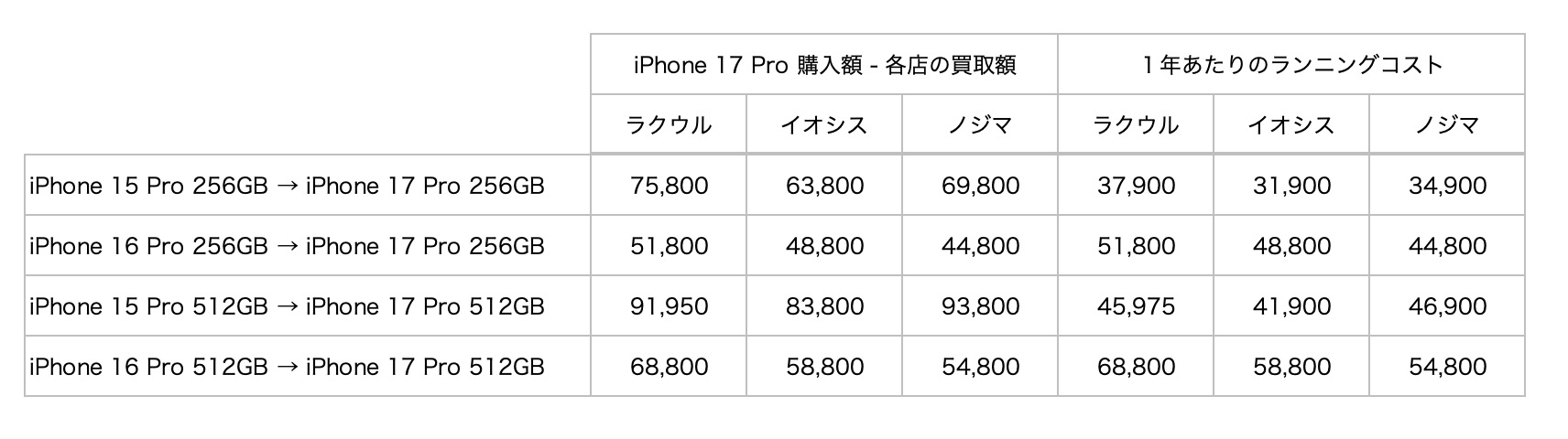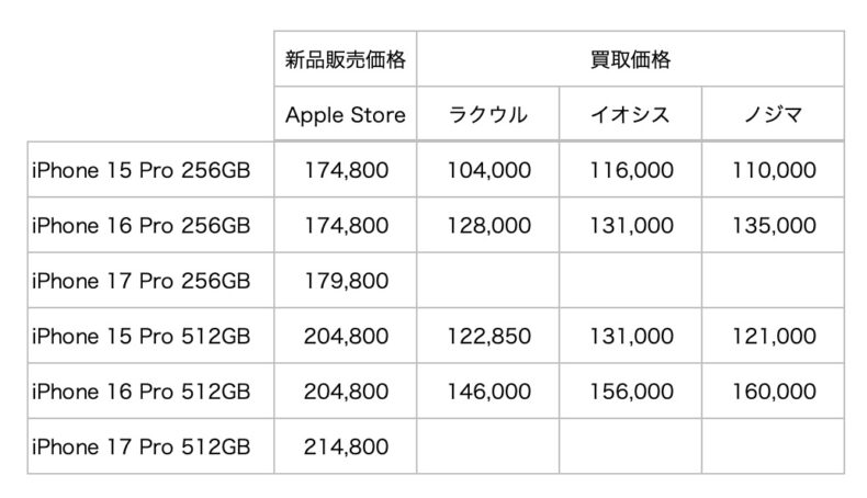 iPhone 17 発売日購入(買い替え)組はそろそろ下取りの査定が出た頃かと思います。大手の買取価格をまとめてみました。(9/23時点)