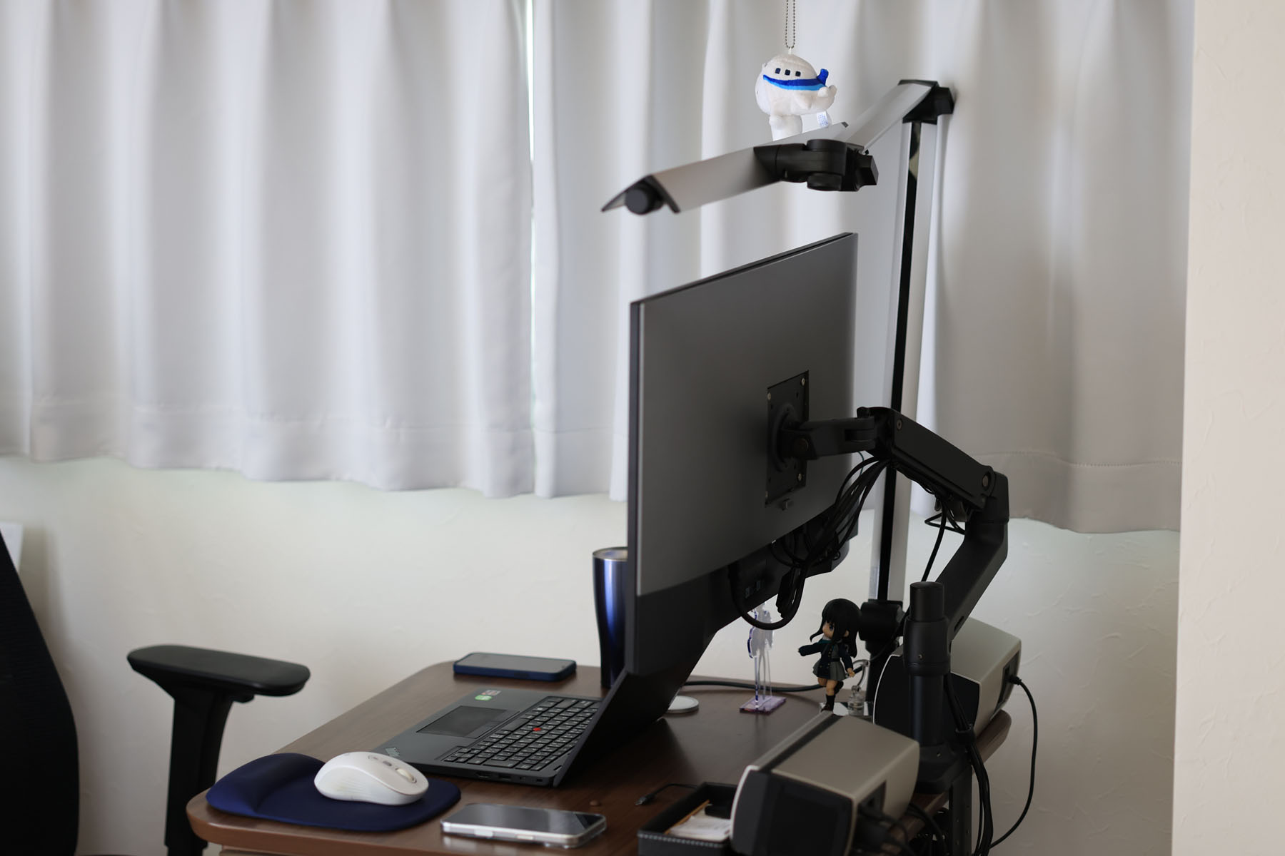 最初、このように机上の左サイドに取り付けたのですが、どうにもこうにも可動域の取り回しが悪く…