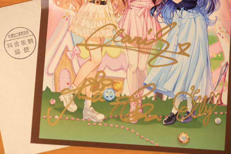サインのところにペイントマーカーのインクの匂いがするし、下絵とのインクの重なりも見られるので直筆サインのようなのですが(すごい)、3人のサインはそれぞれが書いてるにしても、「ClariS」の部分は誰が書いているのか、ファンの間でも話題になるようです。決まった誰かが書いているわけではなく、3人で手分けして書いているようなので、「ClariS」の部分は筆跡が3種類あるわけですね。