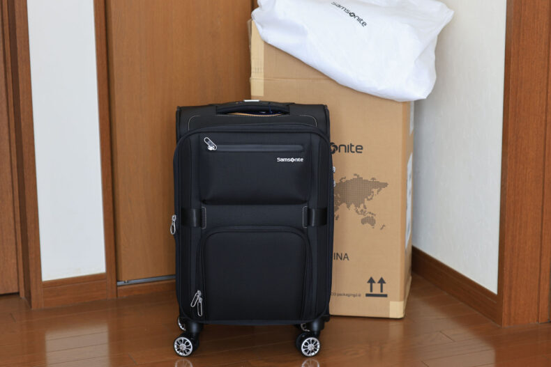 つくばのサムソナイトの物流倉庫から八潮の Amazon を経由して、箱に入ってやってきました。スーツケースを箱で買ったのも初めてですし、白い布で包まれていたのも初めてです。サムソナイトのこのサイズでは最廉価なのに、土屋鞄かよ……と思いました。