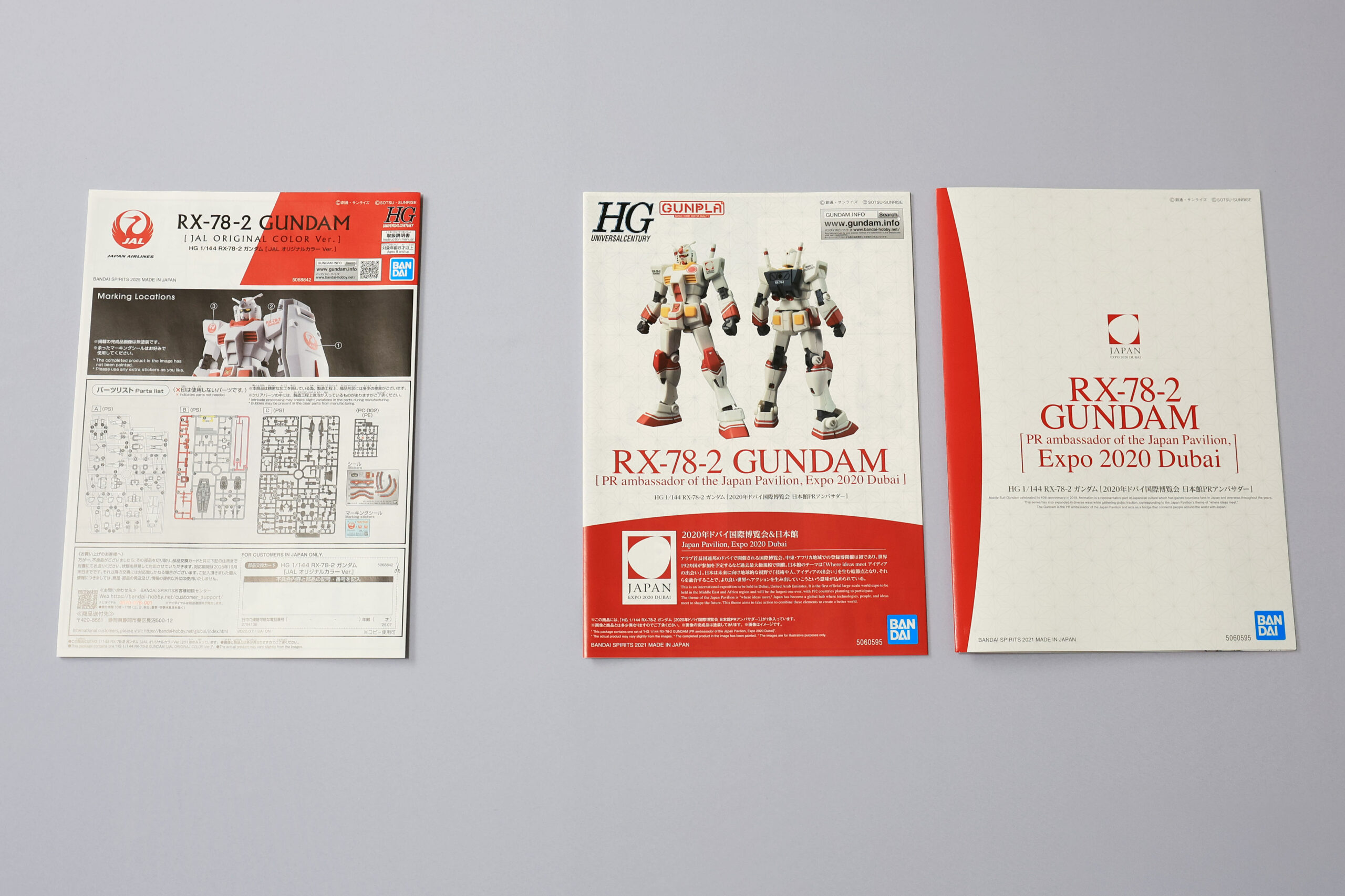 説明書。左がJALガンダム、右がドバイガンダムと、ドバイガンダム付属の厚紙見開きリーフレットです。中では大河原邦男氏が語っています。