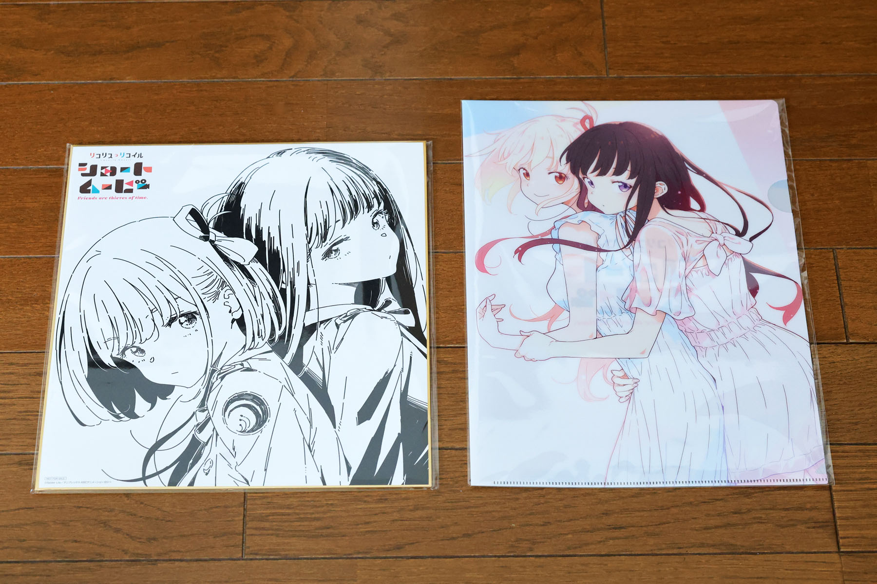フルサイズの色紙(左)と、Blu-ray予約画面を持って定められた期間内に錦糸町まで取りに行くともらえるクリアファイル(右)。このクリアファイルの絵柄はXとかでも高評価ですね。なかなか尊いと思います。