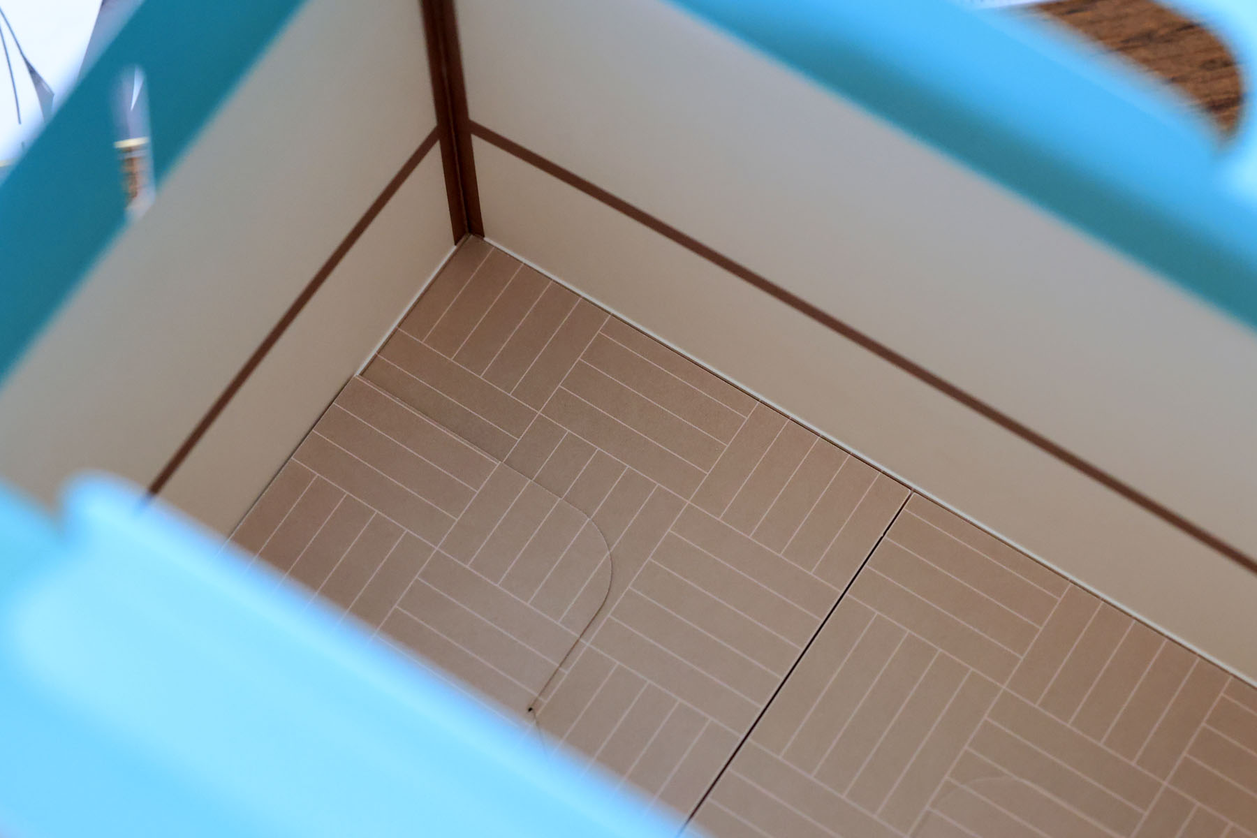 喫茶リコリコの床と壁を模した印刷が入っていました。ここまでやるなら、付属品はアクリルチャームじゃなくてアクリルスタンドにして、この箱を使ってジオラマを作れるようにした方が良かったのでは…。