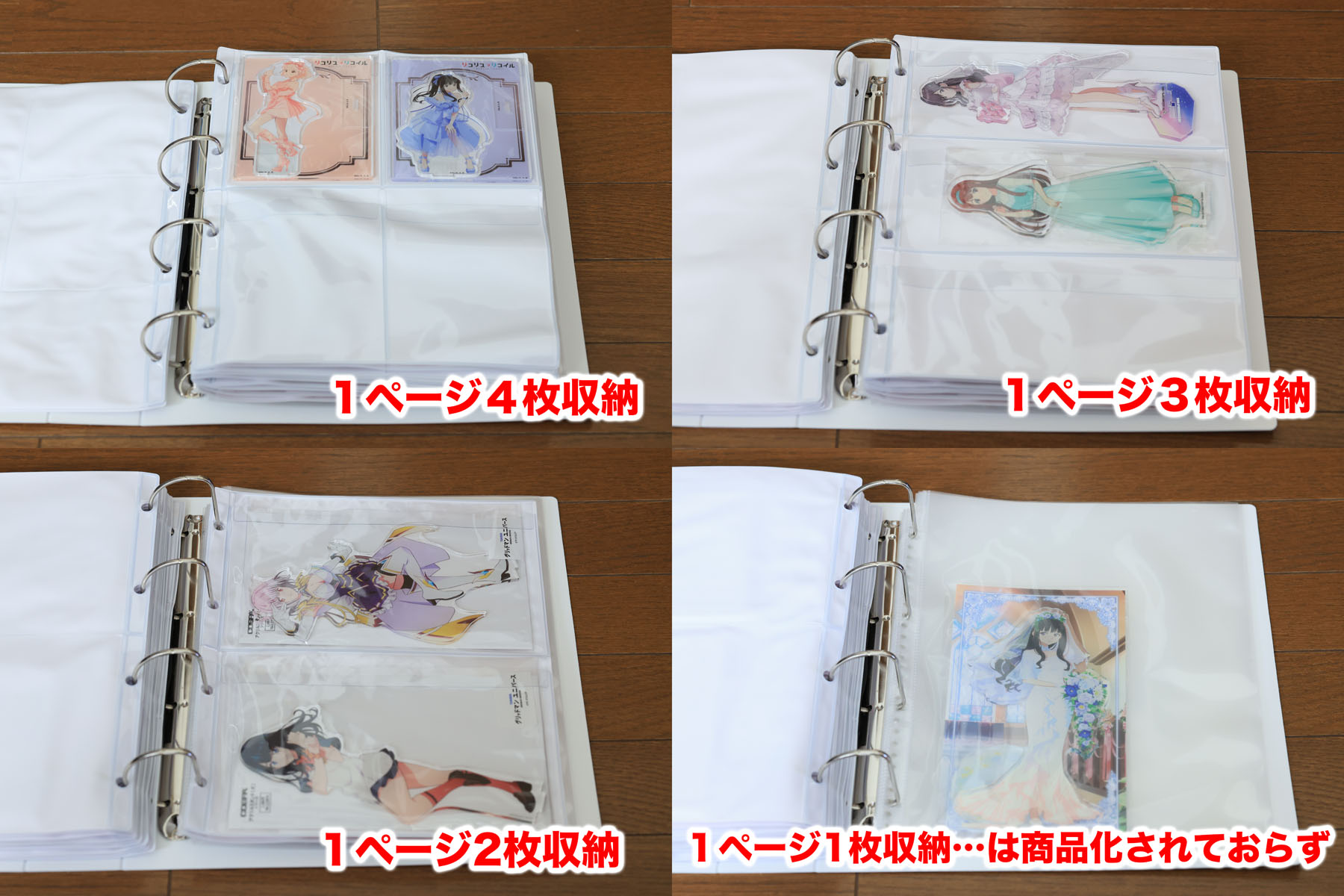 そこに別売の「PVCリフィル」を入れて使います。ポケット数に種類があり、上記は1ページあたり6ポケットのもの。6ポケットは小さいのでアクスタというよりは缶バッジを念頭に置いているようです。でもこのサイズのアクスタもありますよね。