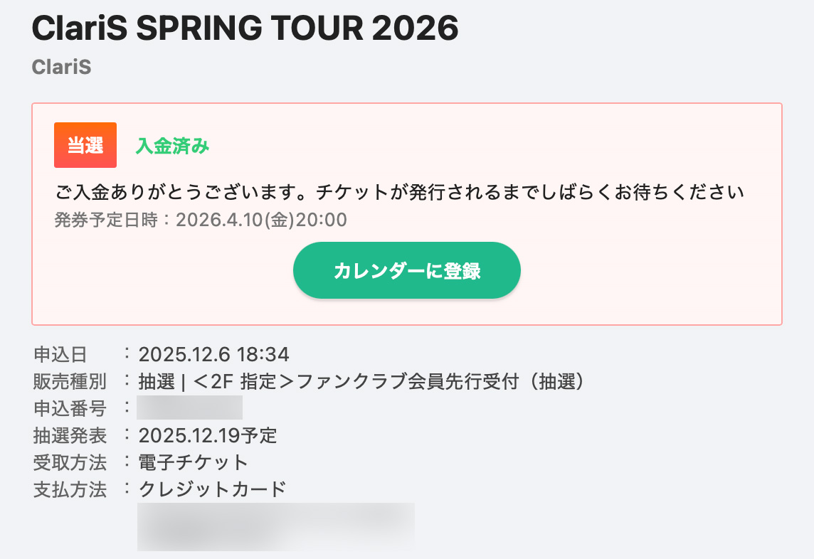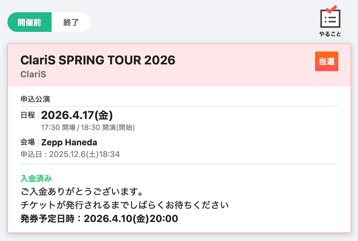 Zepp羽田会場の1Fはオールスタンディング(立見)だというので、319席しかない2階席のみに応募したのですが、当選はさすがFCといったところですかね。1F / 2F 双方の申し込みもできたのですが(ただし当たるのはどちらか一方)、スタンディング席で3時間近く立っていられる自信がなかったので、もし 2F 外れたらこのライブ自体見送りでいいや、くらいの気持ちで応募しました。Xを検索すると FCは全員当選か?というようにも見えたのですが、当落発表からしばらくすると 2Fの落選報告も出てきたりして、全員当選というわけでもなかったようです。