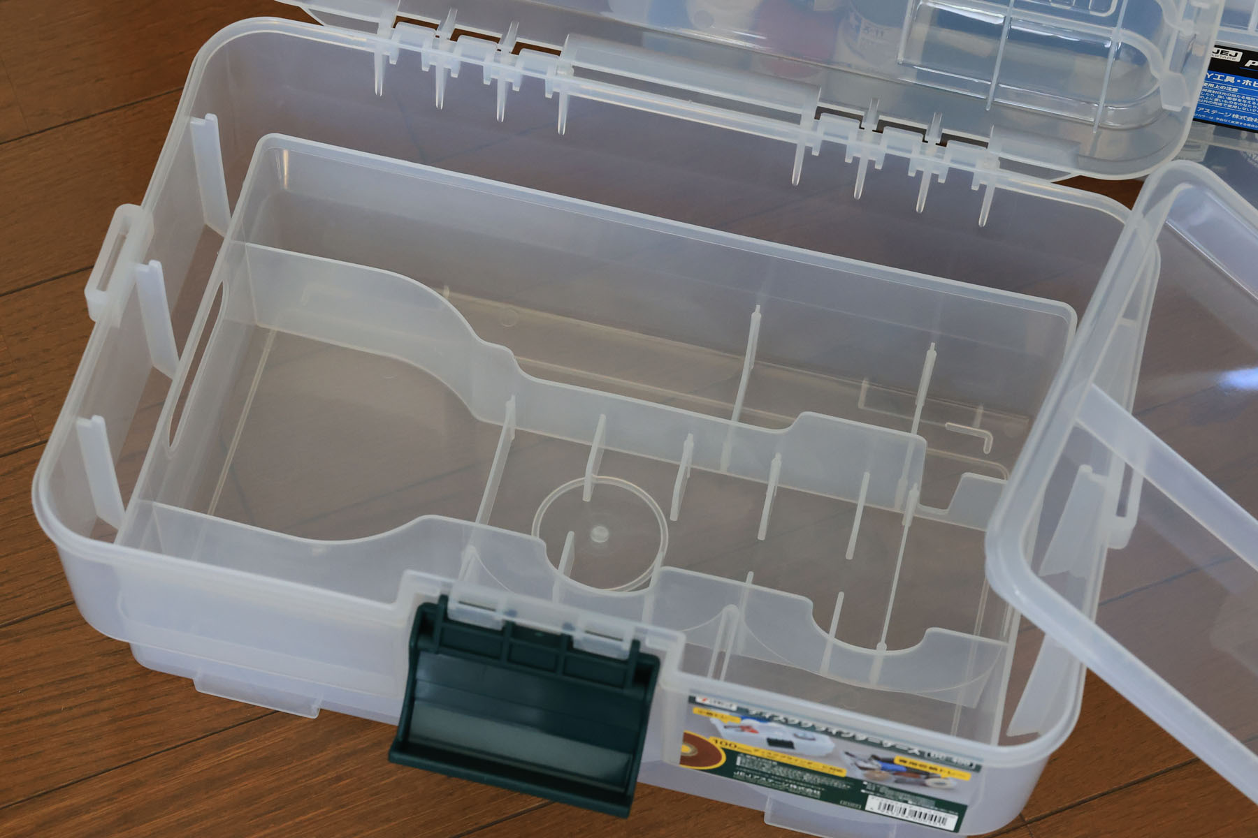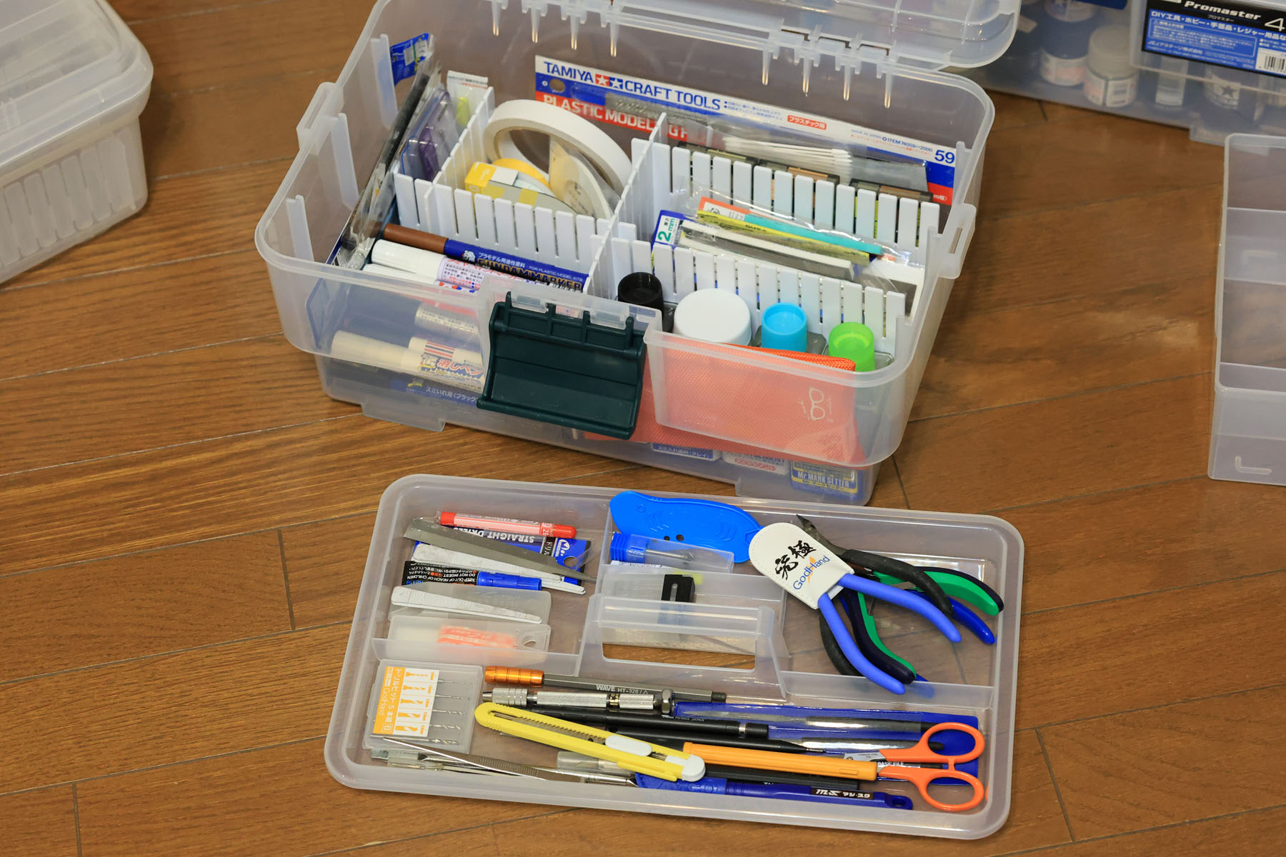 こういう感じに、塗料・筆関係(要は溶剤臭いもの)と、それ以外を別の工具箱に分けています。ガンプラのようにほとんど塗装しないで済むキットを作ることを前提とすると、案外この分け方でなんとかなったりします。(ほかにもラッカー系塗料専用箱とかエアブラシのコンテナとかもありますがここでは割愛。)