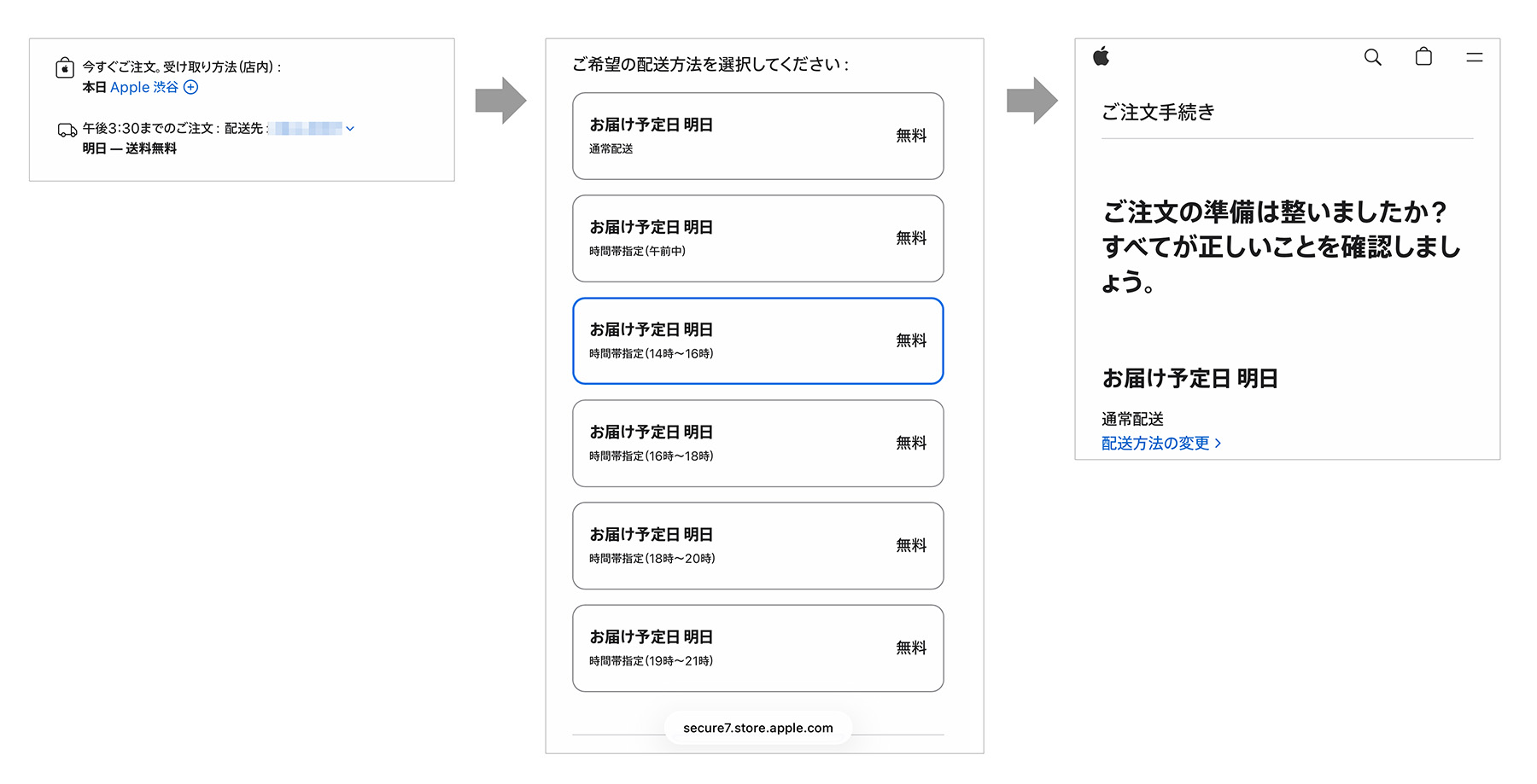 Apple公式サイトで商品をバッグに入れ、注文手続きを進めている最中は「明日お届け」や「本日中の注文で明日着」と表示されています。