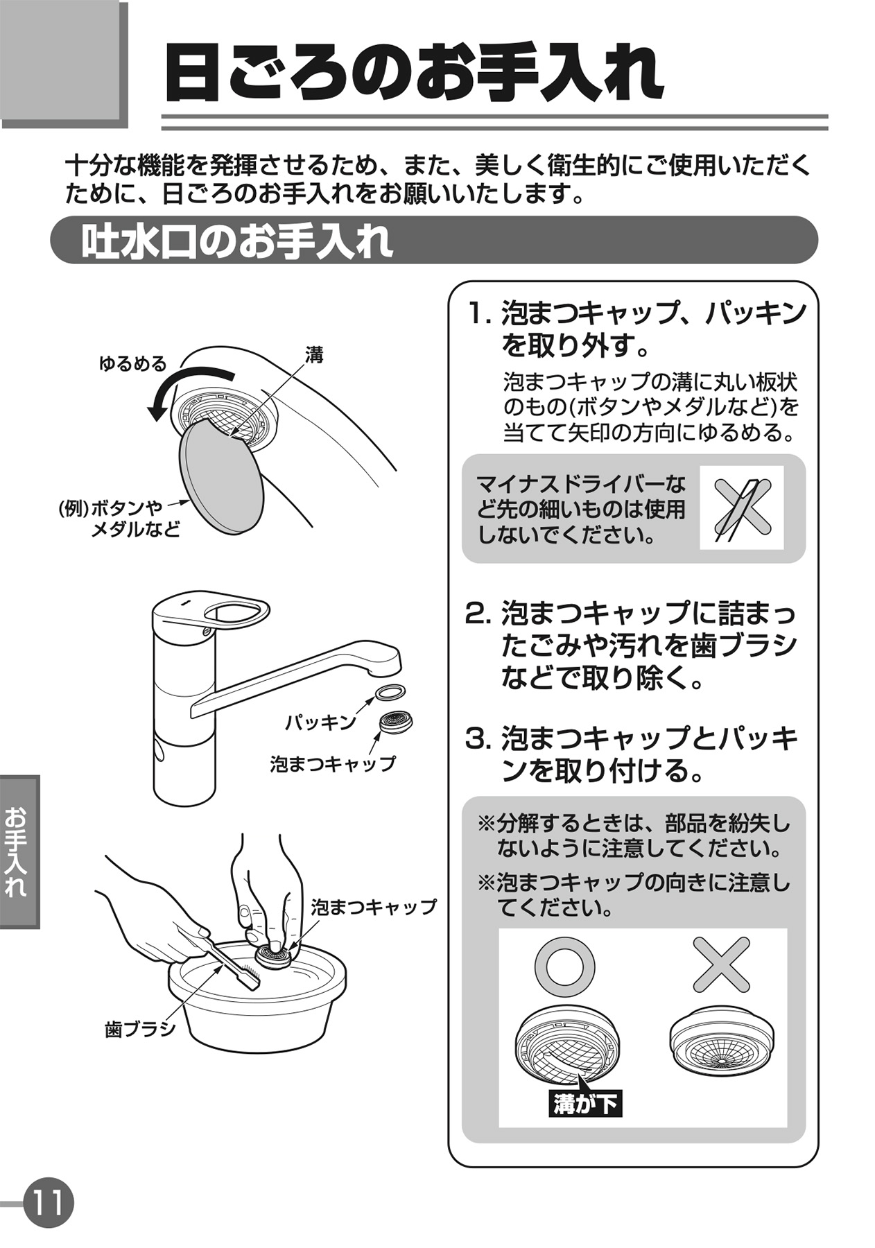 最近、キッチンの水栓の水跳ねが気になるなぁ、きっと吐水口のところのフィルター(泡まつキャップ)が詰まってるんだろうなぁ…と、説明書でフィルタの外し方を確認。