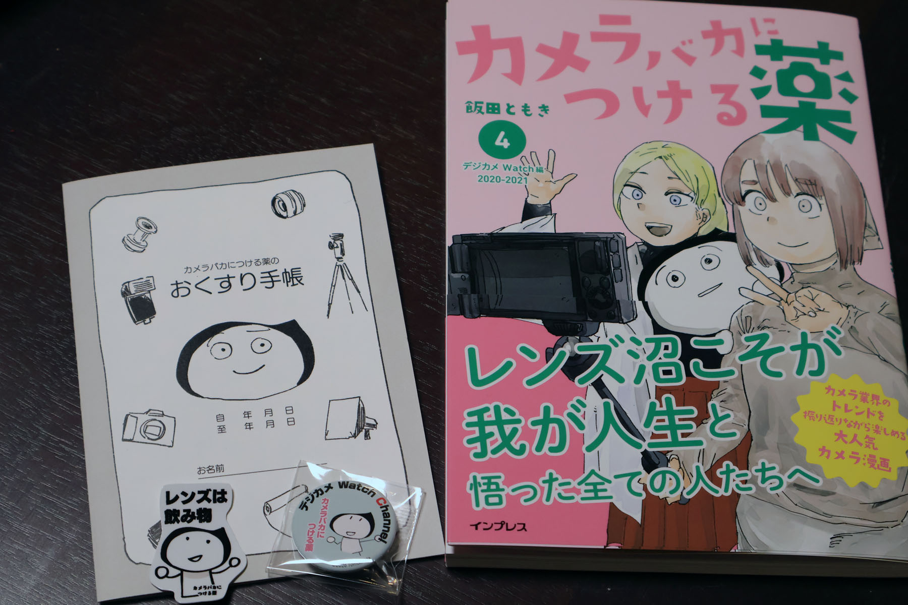 戦利品。カメラバカ 先行発売4巻と、ノベルティ。「どの絵柄のバッジにしますか?」とインプレスの人に聞かれるのですが、「患者」でちゃんと通じます。