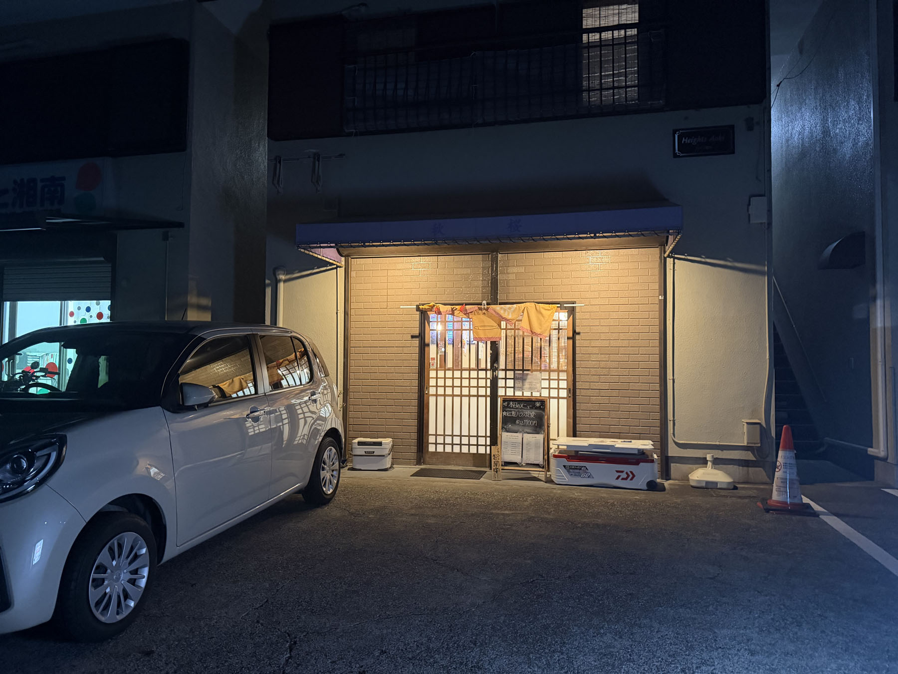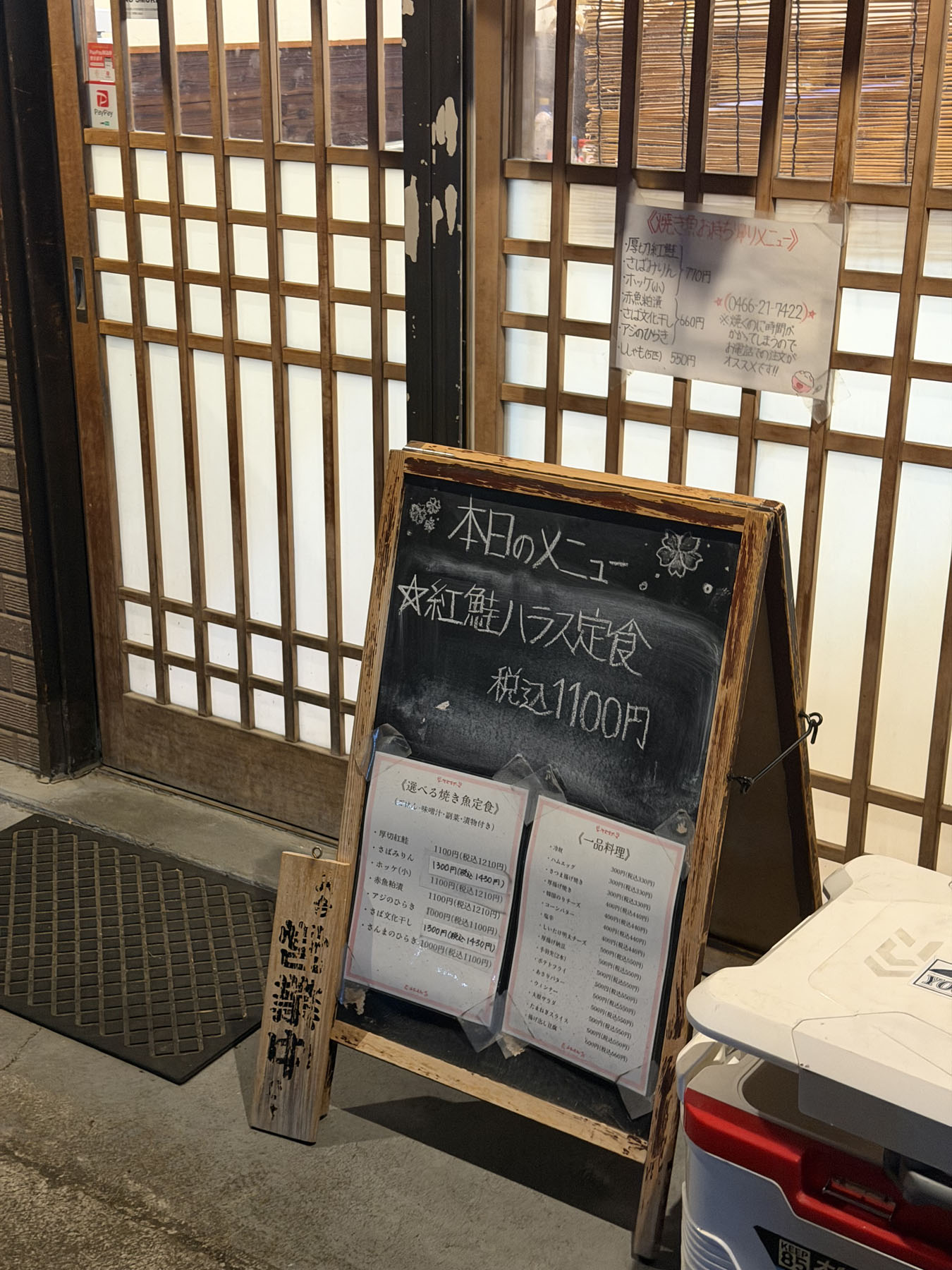 基本的に「焼魚の店」です。玄関の右側に白い箱がありますが、ダイワ精工のロゴが入っているのでクーラーボックスでしょうね。これに魚を詰めて仕入れてくるのでしょう。