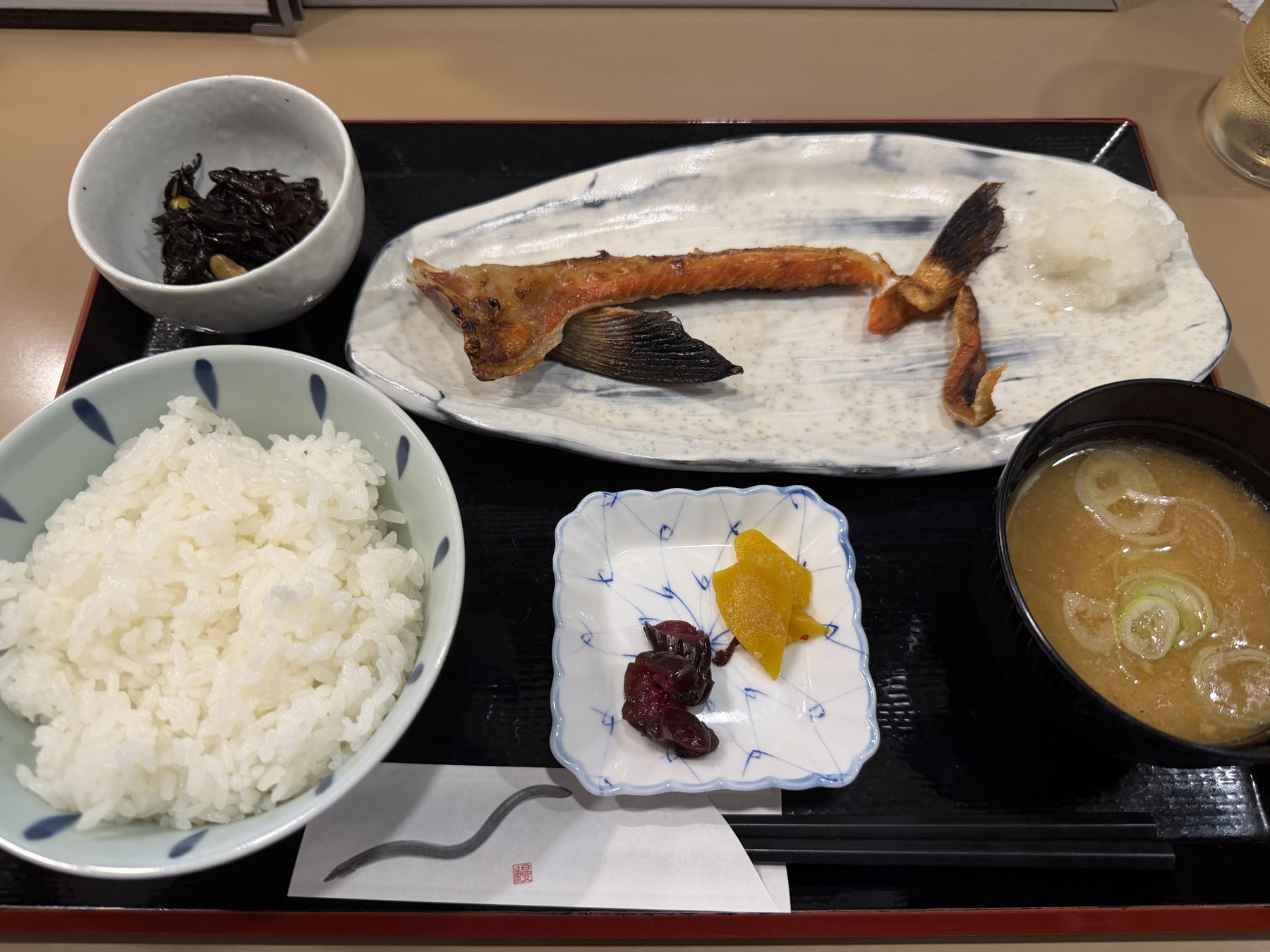 劇中メニューであれば「さばみりん」なのでしょうが、メニューを眺めたときに脳裏に家族の「さばみりんはもう飽きた」というネガティブな感想が頭をよぎってしまったので(自分が外食で食べにきてるのだから関係ないんですけどね)、外の看板に書かれていた本日のおすすめメニュー「紅鮭ハラス定食」で、味噌汁を豚汁に変更(+110円)してもらいました。