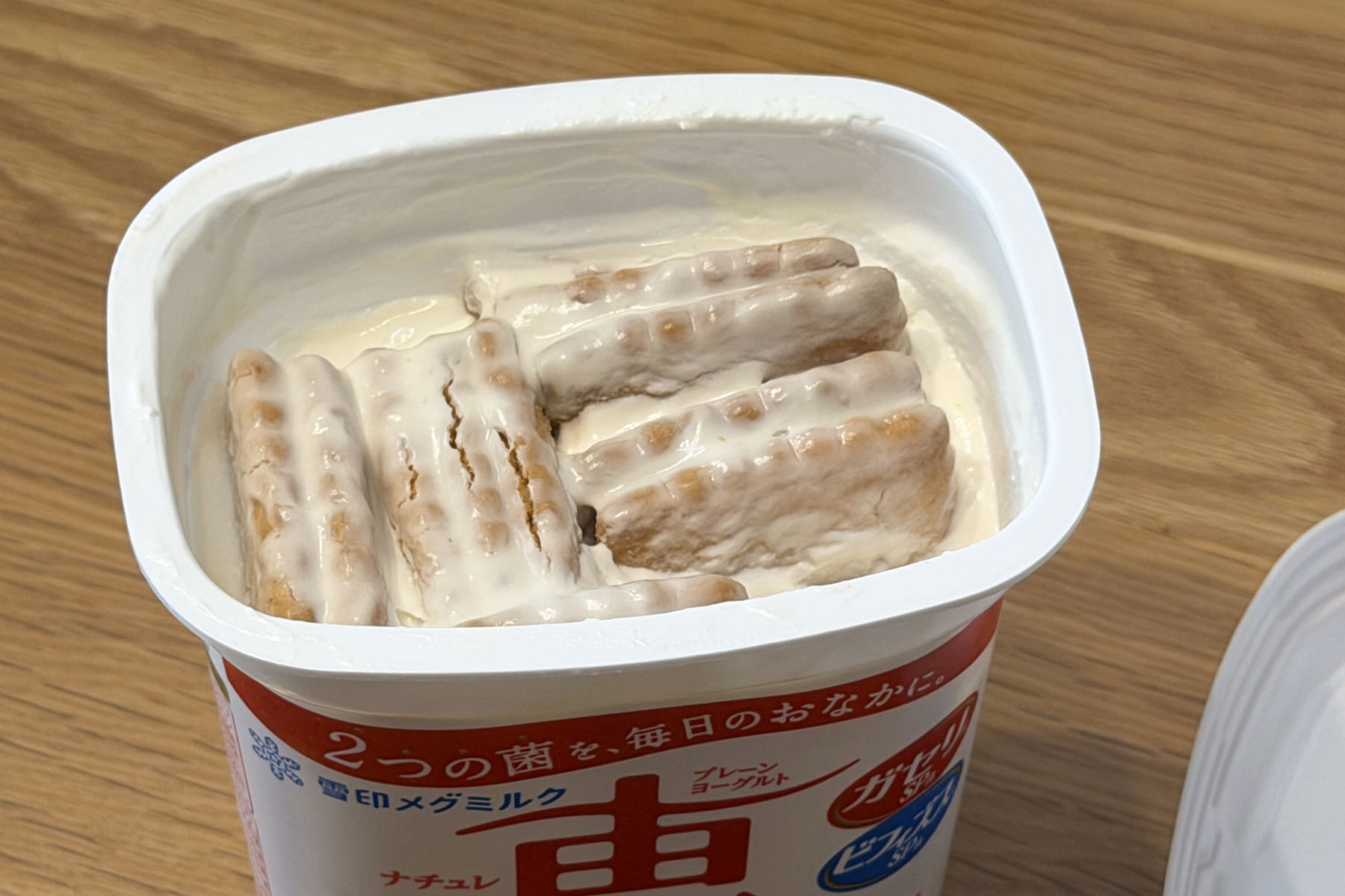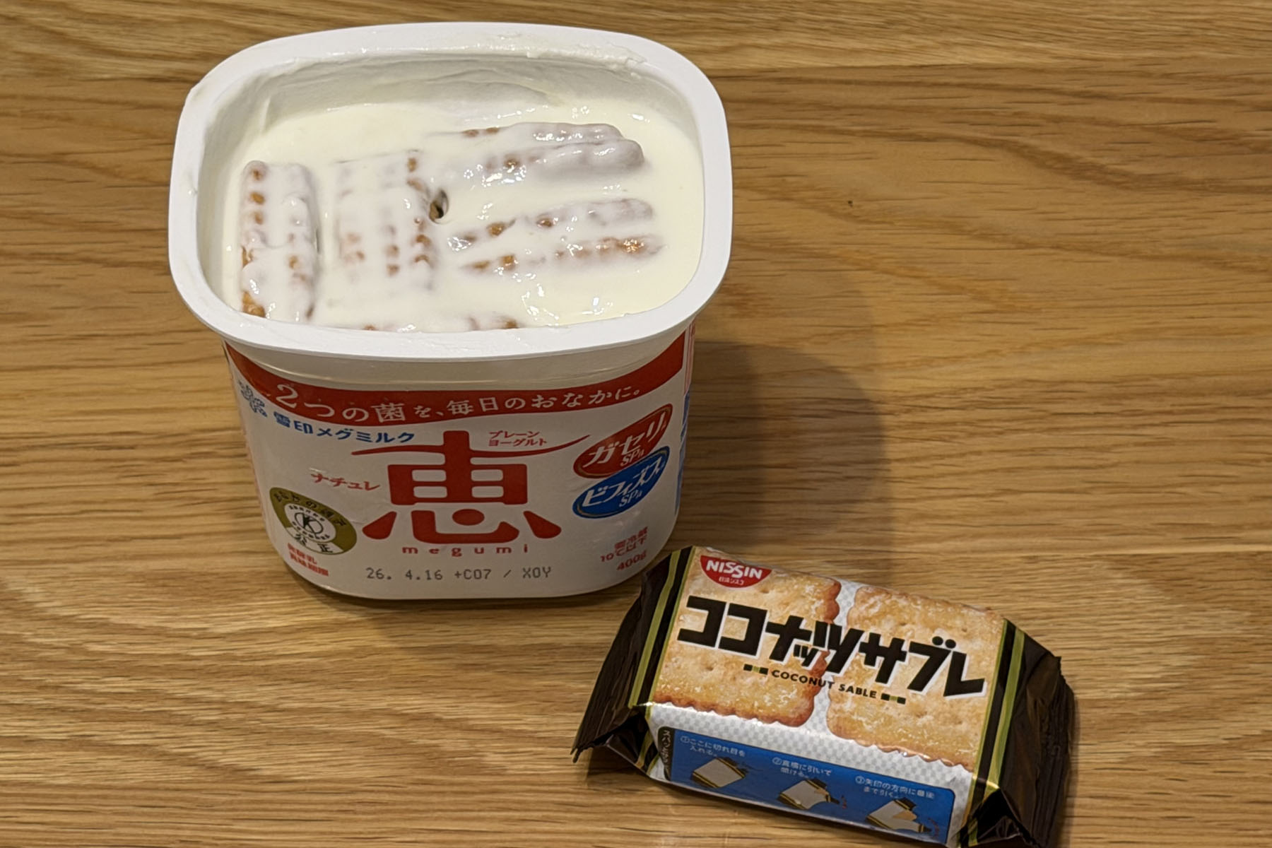 SNSでバズっていた「プレーンヨーグルトにココナツサブレを浸して半日置くとレアチーズケーキになる」というのを試してみるかと思ってやってみました。1軒目のスーパーでは3種類味のあるココナツサブレが全滅で、SNSの影響か!?と驚きましたが、2軒目のサンドラッグで普通に山積みでした。