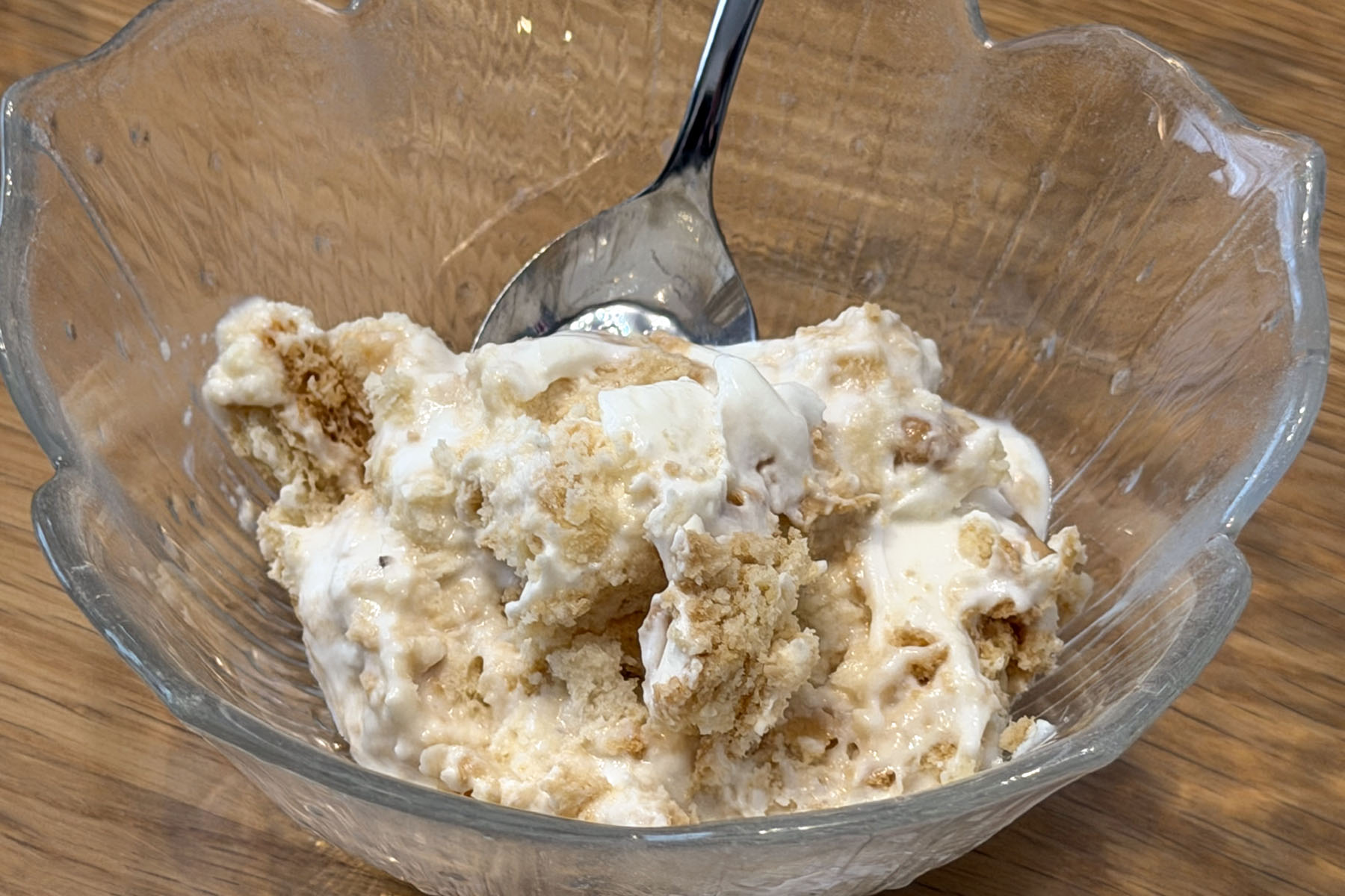 あらかじめ水切りしたプレーンヨーグルトにココナツサブレを沈めてゆきます。すでに水切りした時点でチーズケーキっぽくはなりますが。ココナツサブレの小袋が3袋(12枚)くらい入りましたかね。