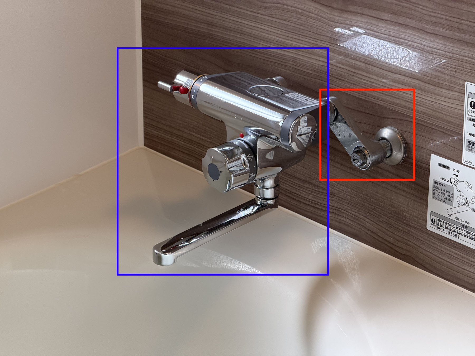 青枠部分を交換しました。TMF47ALRB のセットには赤枠部分(アーム)の部品も付属していたので交換したかったのですが、外れるかどうか力を入れてみたところびくともしませんでした。よって深追いはせずにこの部分は蛇口本体と接続する部分のパッキンだけ新しくして、アーム自体は古い部材をそのまま使いました。