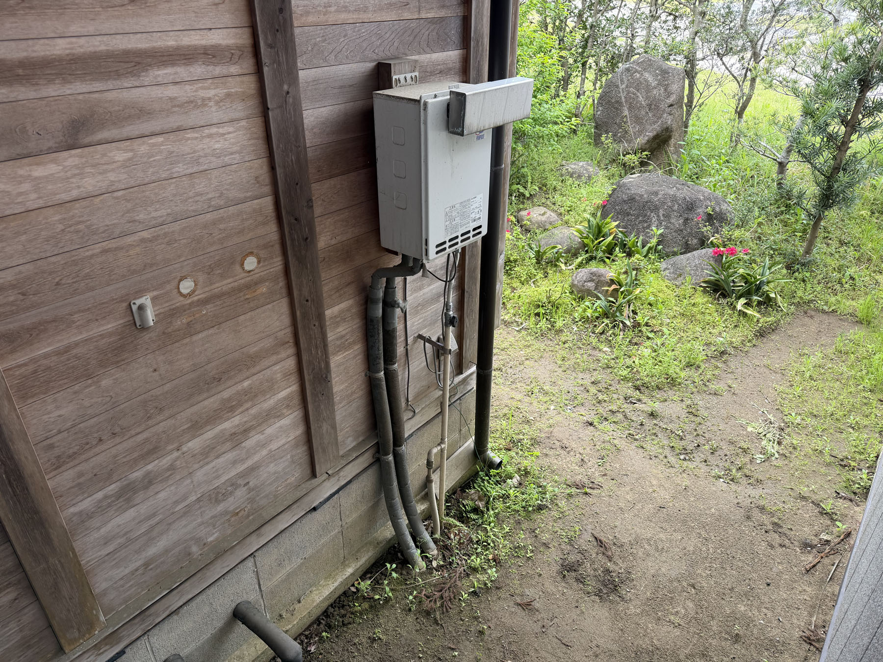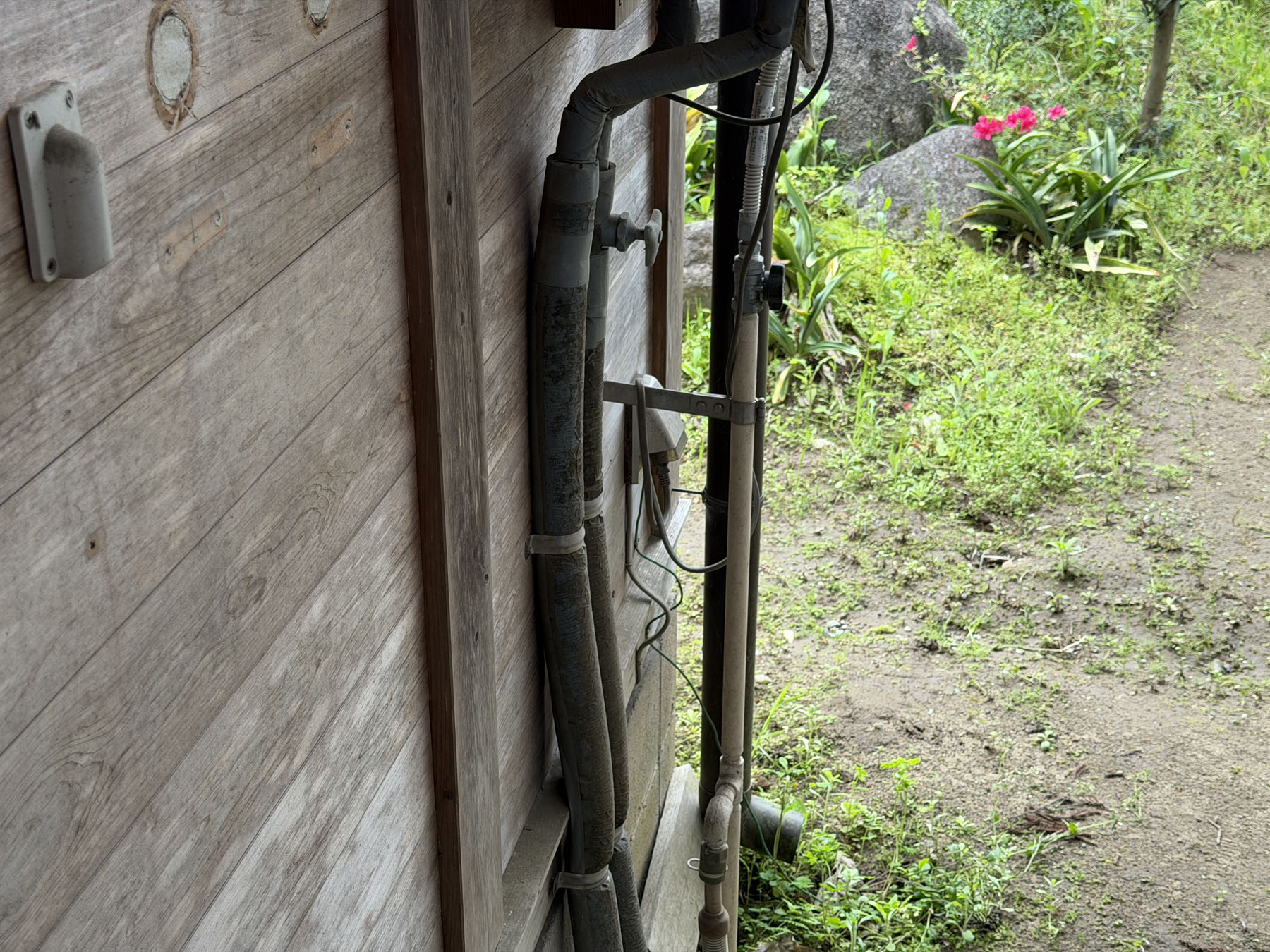 これはその蛇口がついている外側の様子なのですが、浴室側で蛇口がついているのはちょうど給湯器の下あたりです。