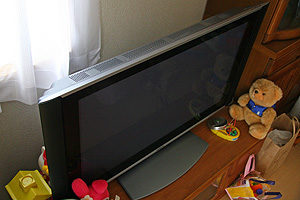 以前のブラウン管ではムスメが画面をギュウギュウ押していたので今度のでも同じマネをされるかと思ったが、案の定、早速同じマネをされた(滅 ただスイーベルスタンドのせいで、押した力で大画面がグルンと回ったのが、ムスメにとって相当腰が抜けるような出来事だったようで、ビクッとしてそれ以来1度も画面に触れていない。