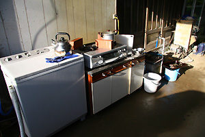 台所。水道は1系統しかないので、洗濯中は炊事や皿洗いができない。なおその1系統とて、ほかにも洗車から足洗いから刃研ぎから金魚にも使っている。ガス台は自然の風で炎ががすぐ消えてしまうので、レンガで風よけ。こんなところで3度の飯をもう4ヶ月も作っている母は偉大だと思う。