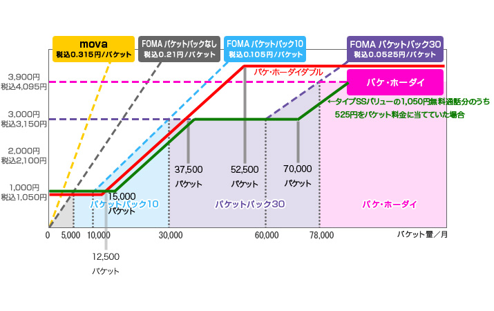 緑の線と赤の線(パケ・ホーダイダブル)を比較すると、12,500パケット以上の領域すべてで値上げになっていることが解る。なお、音声通話をせずにパケット通信ばかり使うほど緑の線は右側に移動するため、実質値上げ額はより大きくなる。また、契約している基本プランがタイプSSではなく、タイプSやタイプMだった場合でも、緑の線は右側に移動することになる。