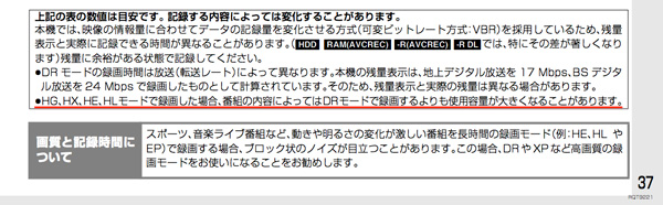 地デジは公称17Mbpsってことになってますが、地デジアニメを録ってみて容量計算すると14~15Mbpsであることが多いので、PanaだとHGモード(12.9Mbps)で録ってもせいぜい1割の節約になるかどうかというところ。これがSD解像度放送とか、サイマル放送(特番やスポーツ延長などでたとえば021chのほかに022chとか023chが放送されている状況)だと10Mbpsを軽く下回るので、HGモードで録るメリットはないでしょう。ブルーレイ自体は場所の節約になるので便利ですけどね。