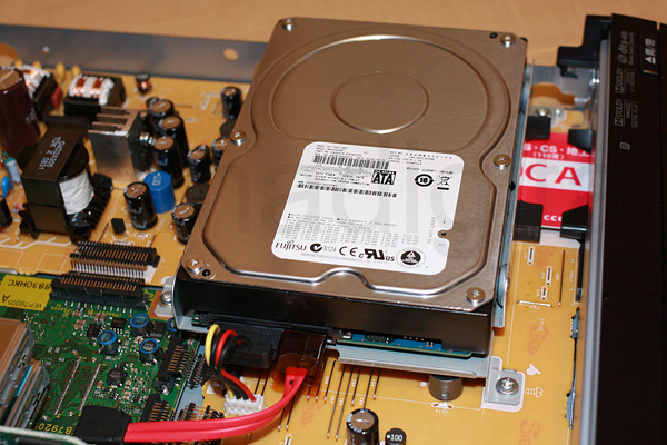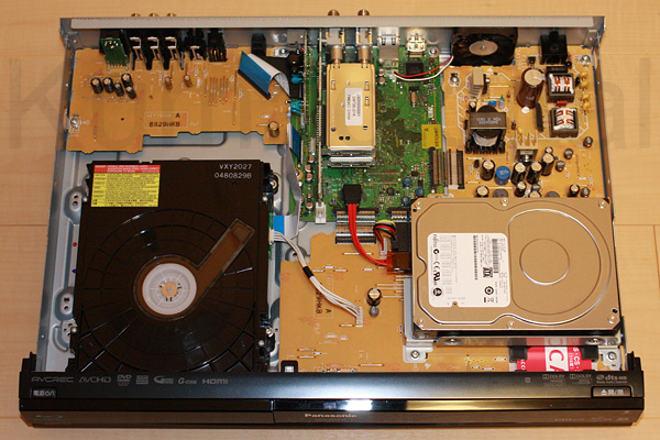 本機の厚さはブルーレイドライブが支配的なようで、HDDは高さを抑える工夫は特にされていない。HDDの下にB-CASカードリーダーやコイル類が見える。なおHDDは富士通製。