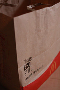 マクドナルドのお持ち帰りの袋が、ビニールから紙製になった。本当にECOなんだろうか。これ。「簡易包装」とあるが、ビニール時代と比べて相変わらず包装の枚数は変わらない。