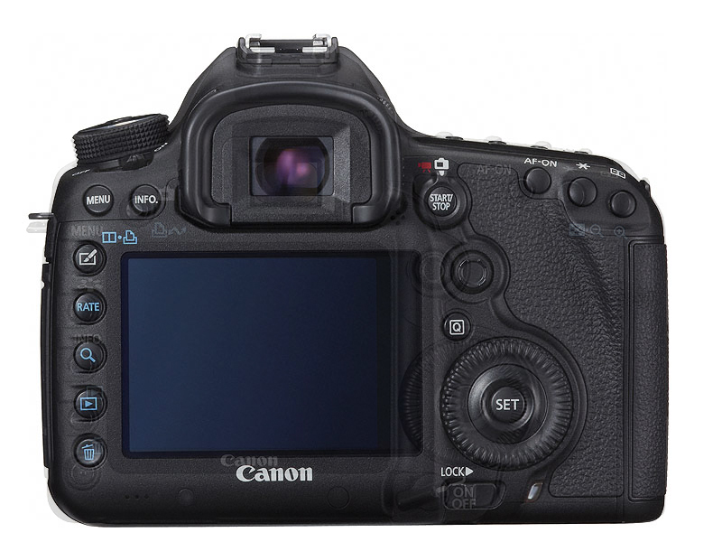 Mark IIと比較してみました。液晶下の「Canon」ロゴが小さい方がMark II、大きい方がMark IIIです。両者の全幅は変わっていませんが、液晶のアスペクトレシオのワイド化に伴い、サブ電子ダイヤルが右に1cmほど移動しています。ファインダーもやや右上に移動しているように見えますが、このほか、ボタンの機能アイコンのシルク印刷が、ボタンの横だったものがボタン上に変更されています。