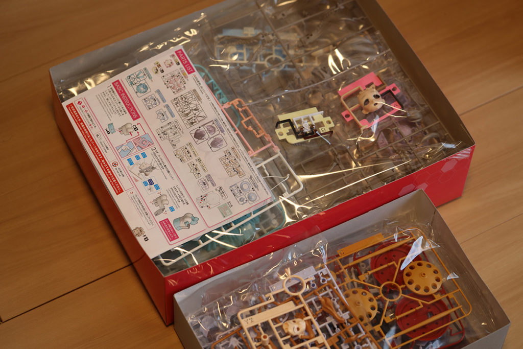 ご覧の通り未組立ですが、メーカーの完成写真などを見ると力が入っている箇所とそうでない箇所の落差が激しかったり(たとえばスカートの上に乗っている花のエッジが甘すぎる)、今までのフィギュアライズラボの成形技術が全投入されているわけではない(たとえば顔以外の肌色パーツはレイヤーインジェクションされていない)のが残念な点ですが、とにかくガンプラでは見られない技術が満載ですので、プラモデルの可能性を体感したい方にはおすすめのキットかと思います。