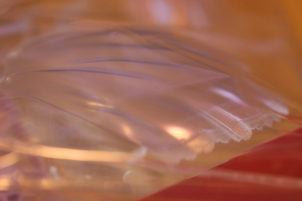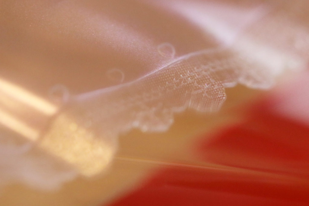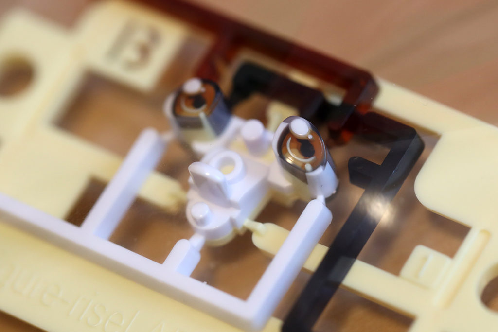 フィギュアライズラボは毎回新技術に挑戦するのですが、今回はプラスチックでどこまでアイドル衣装を再現できるのかがテーマ。たとえばこれ、偏光パール素材です。