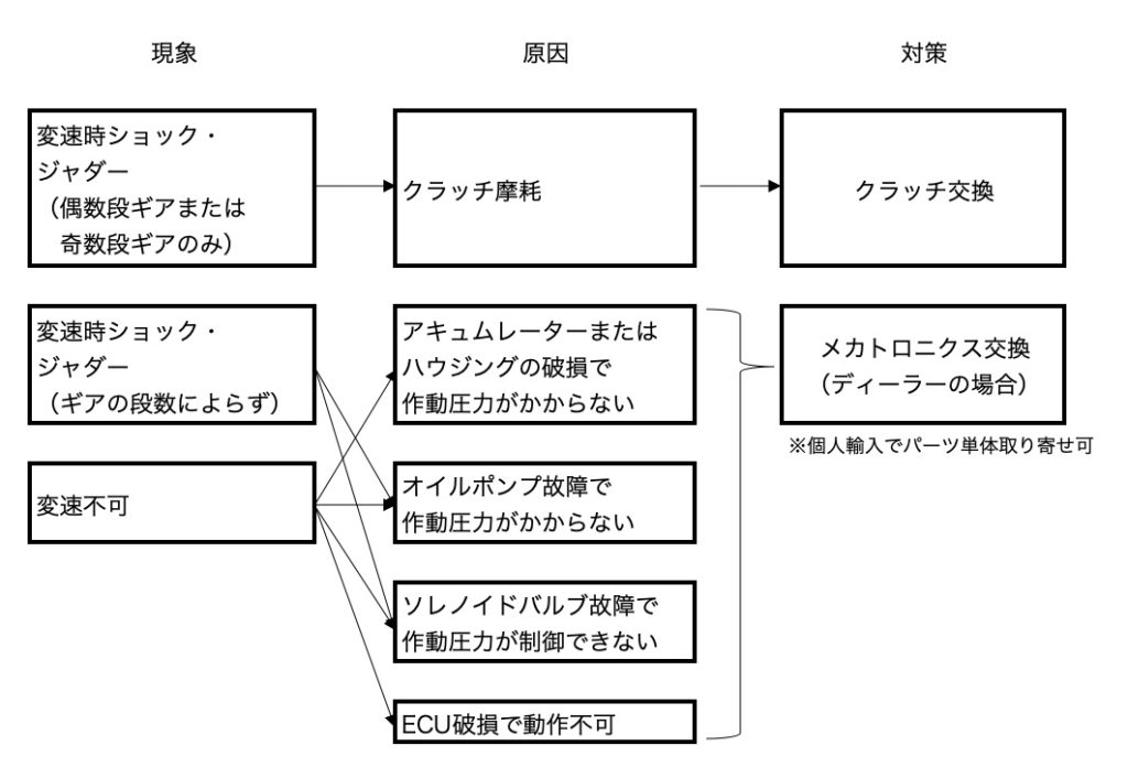 私の場合は奇数段ギアのみで不具合が発生しているので、メカトロニクスではなくクラッチ交換っぽいですね。両方よく壊れる対象なので、クラッチを交換したところで次はメカトロニクスか、というモヤモヤ感は残りますが、どちらも本来はクルマの寿命の間はメンテナンスフリー前提の設計のようなので、修理後にメカトロニクスが壊れないことを祈ります。