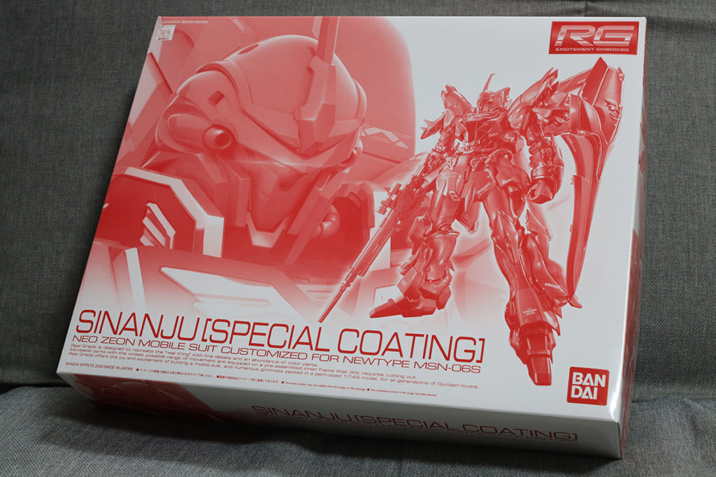 新幹線の中でポチった記憶のある、RGシナンジュ(スペシャルコーティング)が届いていました。なんか久しぶりにジオンの機体を買った気がします。正確にはネオ・ジオン残党ですが。前回ジオン系の機体を買ったのは何だったでしょうか…記録を見たら2004年の1/60 PGザク以来でした。はいぱーギャン子というのもありましたがあれはジオン系と言っていいのか…。アッシマーはジオンじゃないしなぁ。つまりなんだかんだでガンダムタイプばかり買っていることになります。