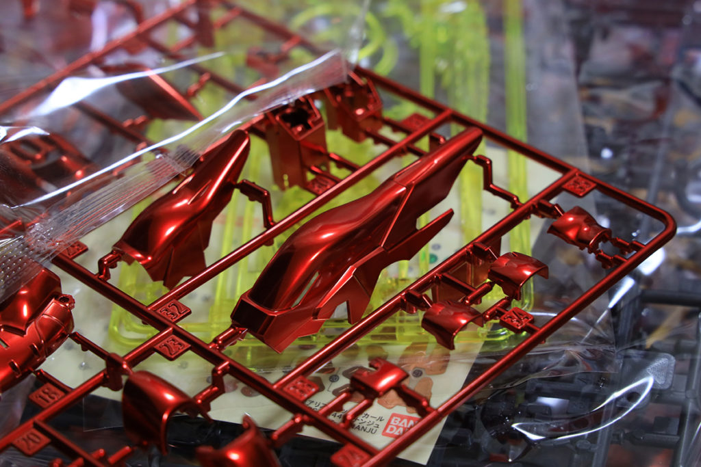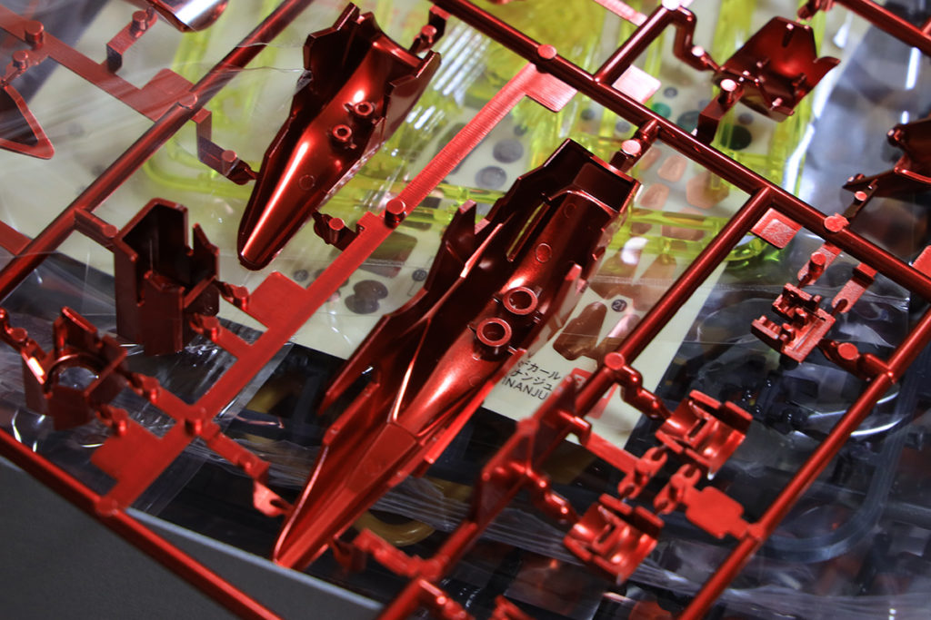 今更気がついたのですが、メタリックレッドが2色ありますね。上の写真の左側のランナーの赤に比べて右の赤は少し朱色がかかっています。実際に現物を並べてみても微妙に色が違います。こういった細かい色の差異ってまたいい味出すんですよねぇ。