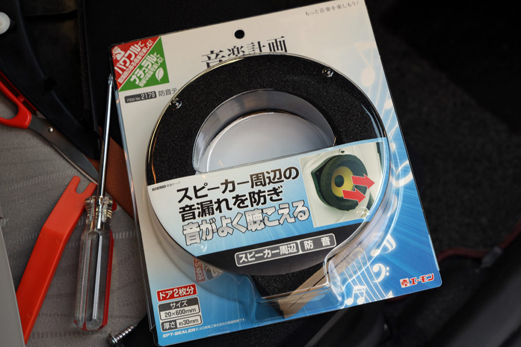 パッソのフロントスピーカーにエーモンの「エーモン 音楽計画 防音テープ(30mm厚)」を取り付けてみました。これはスピーカーとドアの内張りの間の隙間を埋めることで、音が内張りから車内側に出る前にドア内部で干渉して音がこもるのを防ぐためのものです。