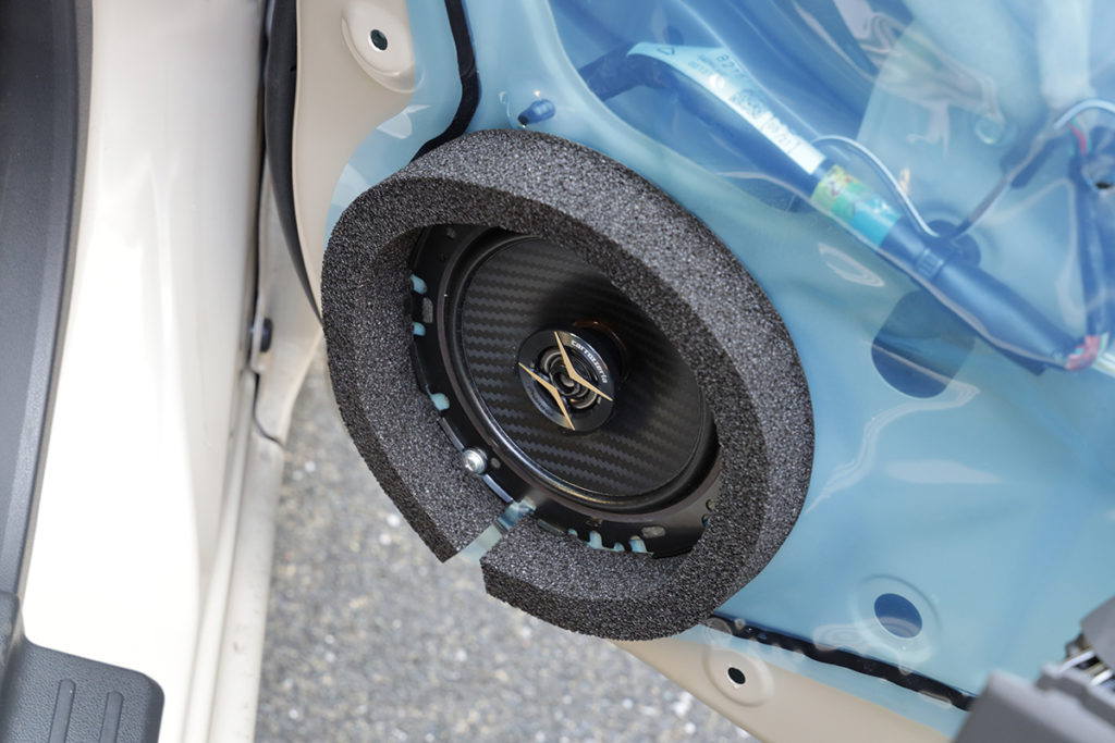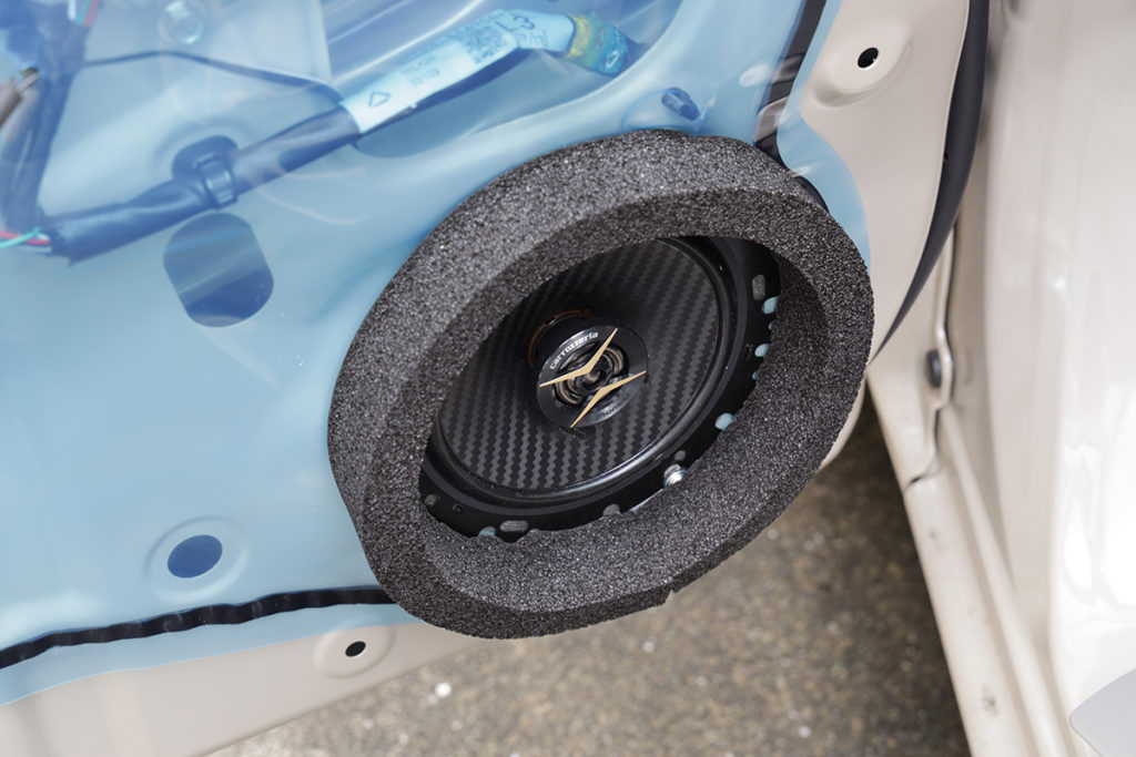 取り付けは簡単で、内張側の筒部分に干渉しないようにスピーカーの周りにぐるっと一周貼るだけです。写真は右側ですが、ちょっと長さが足りませんでした。