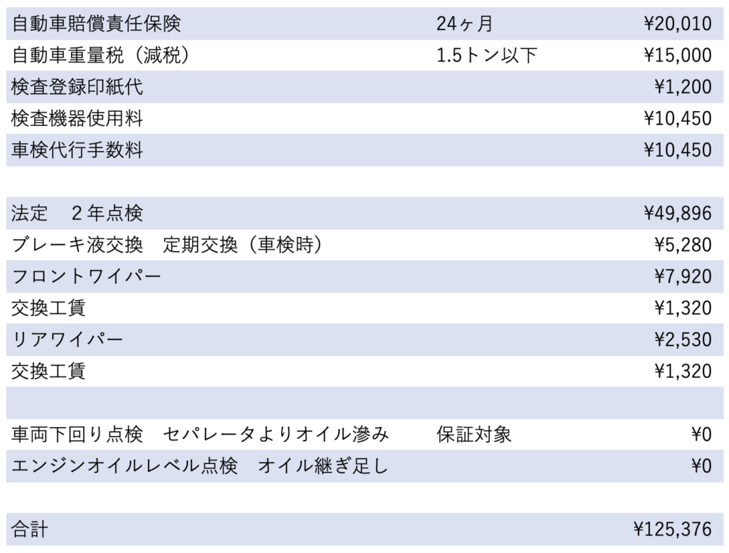 5年目の車検終わりました。品質安定期なのか、大きなトラブルはありませんでした。通常車検時に実施するオイル交換は過走行のため1月に実施済み、エアクリーナー(エアコン)はDIY交換したので、そのぶんは含まれていません。