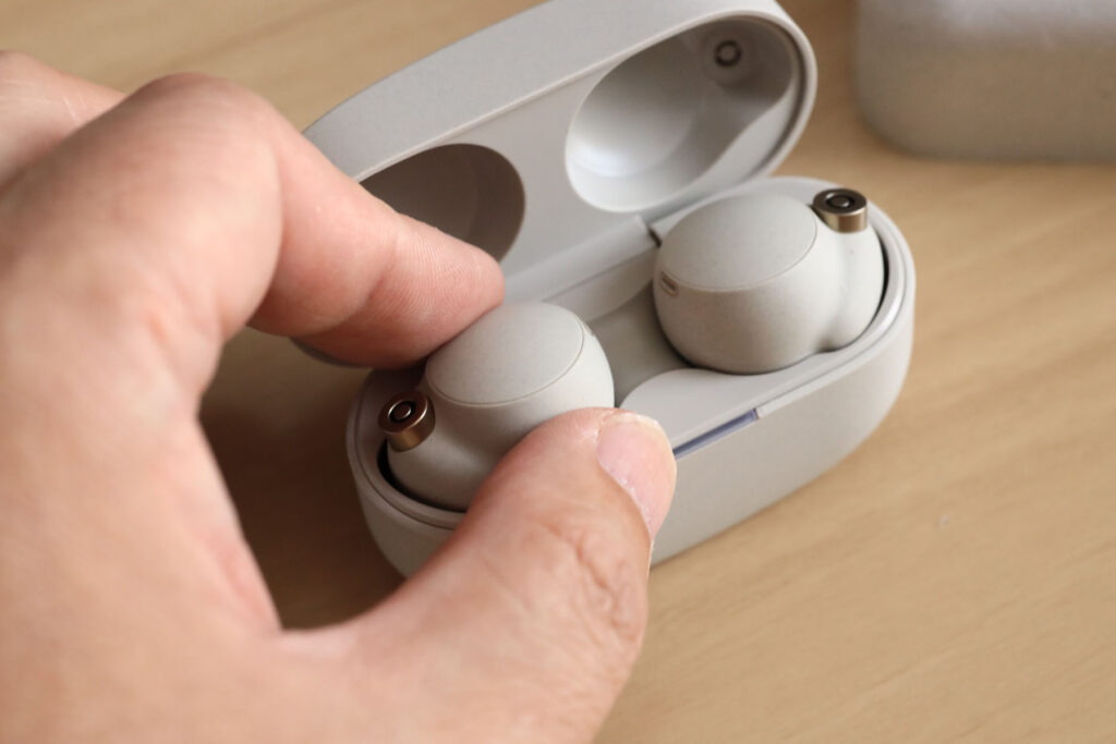 イヤホン本体にLEDがないので、電気接点込みで正しく本体に収納されたかどうかをどうやって確認するのだろうと思いましたが、入れた瞬間にケース側のLEDが1回だけ点滅するので、それを持って正しく収納されたと判断する仕組みのようです。