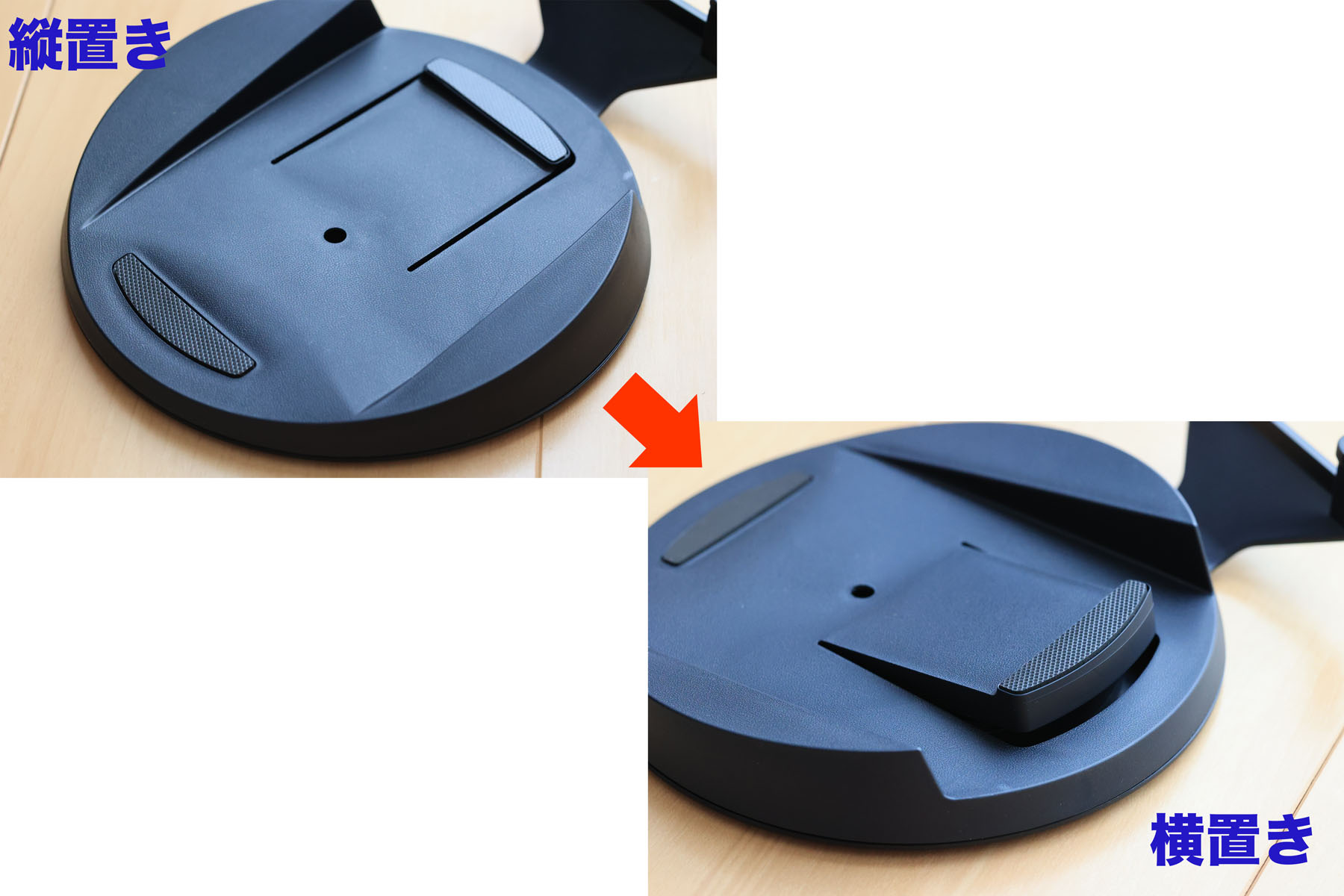スタンドのトランスフォーメーションも面白いですね。回転させることで横置き時と縦置き時のそれぞれに要求される形状に微妙に変形するのです。